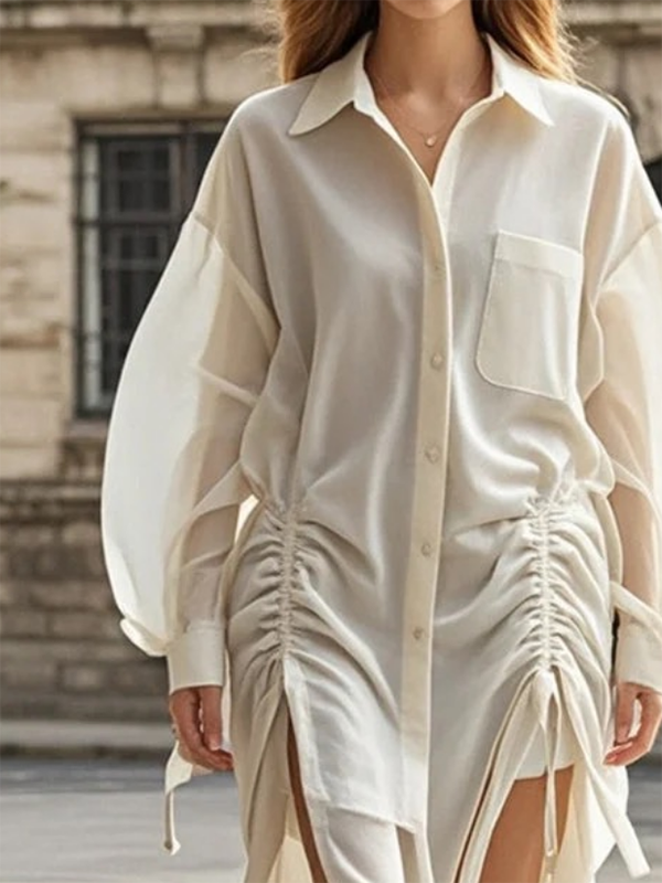 Long Sleeves Loose Buttoned Drawstring Pleated Pockets Solid Color Lapel Midi Dresses Shirt Dress