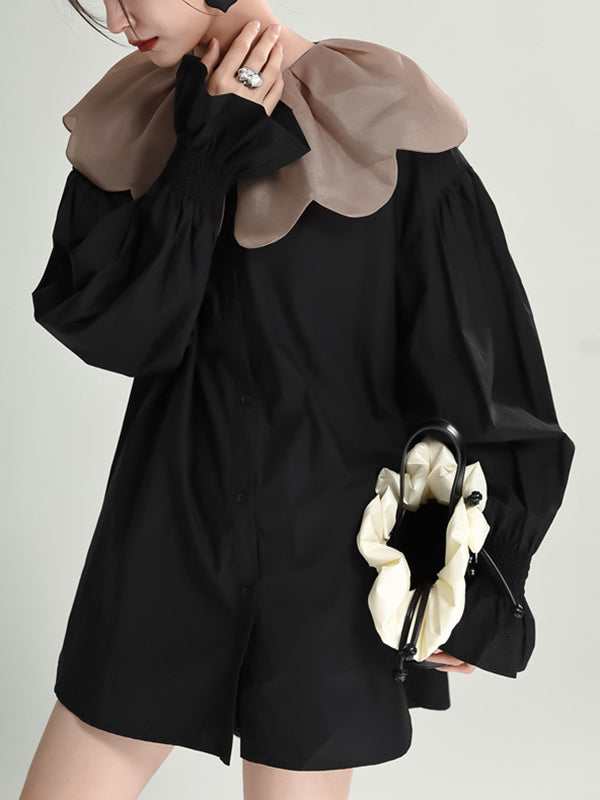 Long Sleeves Loose Contrast Color Elasticity Pleated Split-Joint Peter Pan Collar Blouses