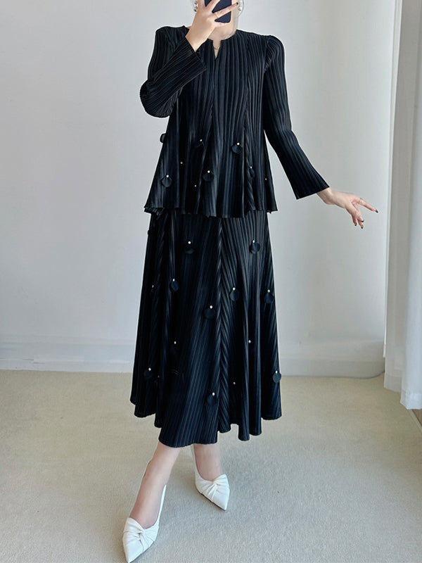 Long Sleeves Loose Pleated Solid Color Three-Dimensional Flower V-Neck T-Shirt Top + Skirt Bottom Two Pieces Set