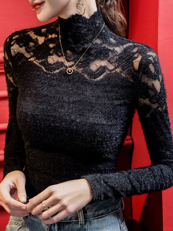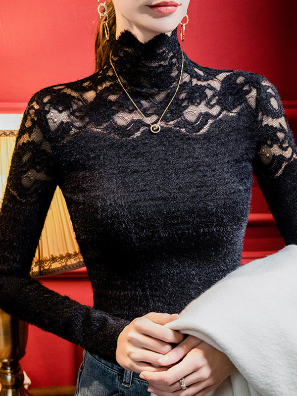 Long Sleeves Skinny Plus Size Solid Color Split-Joint High Neck T-Shirts Tops