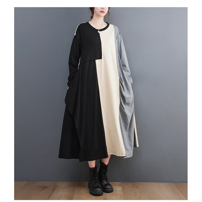 Loose Color Blocking Splicing Round Neck Midi Dress