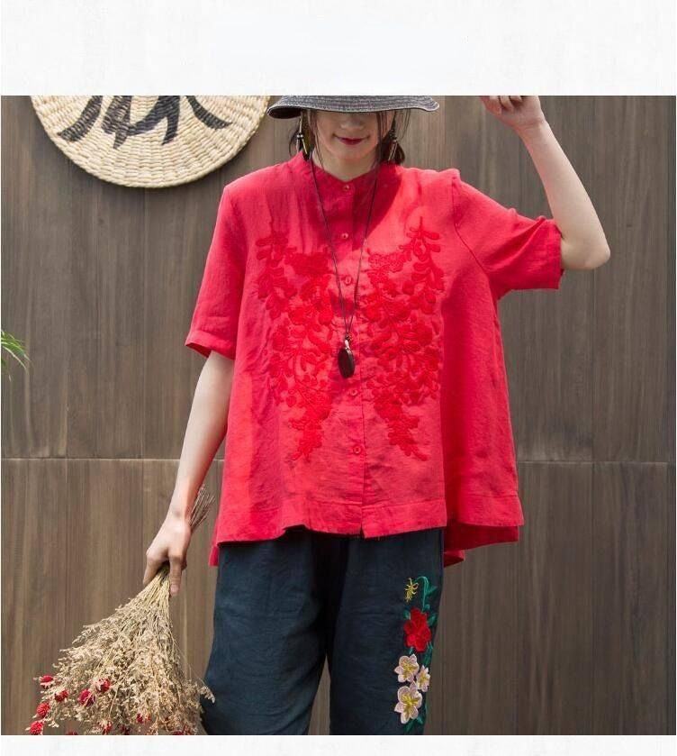Loose Cotton Embroidered Short Sleeve Stand Collar Shirt