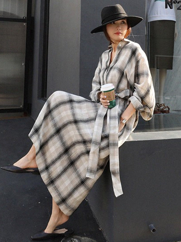 Loose Plaid Long Sleeve Lapel Maxi Dress