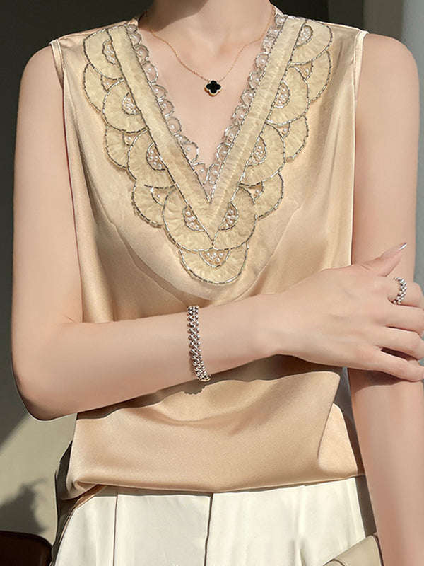 Loose Plus Size Beaded Split-Joint V-Neck Vest Top
