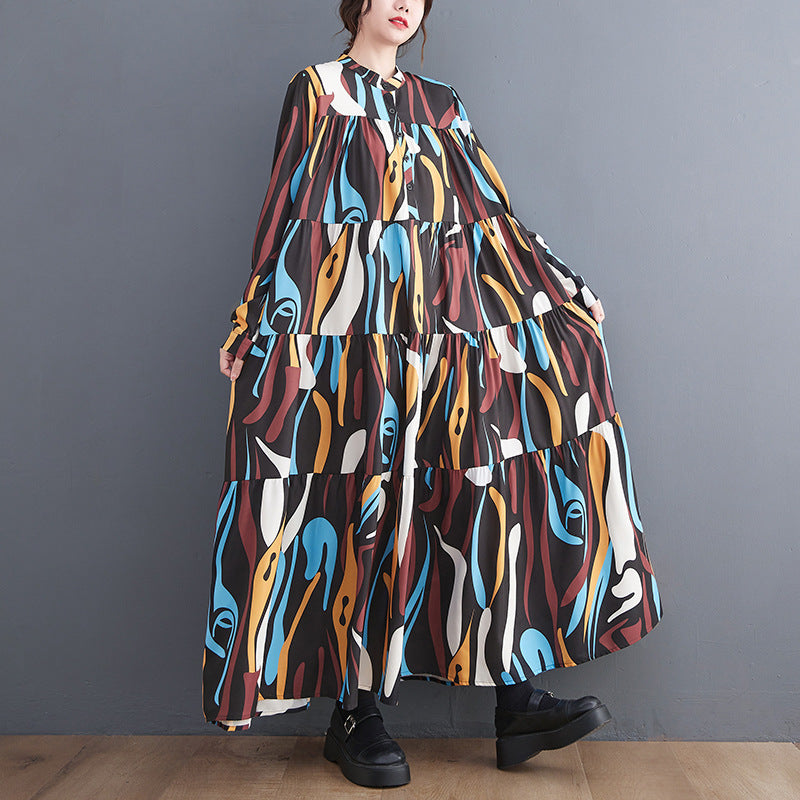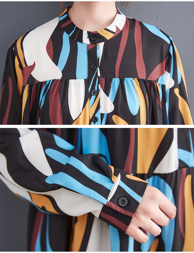 Loose Print Pleated Round Neck Midi Dress