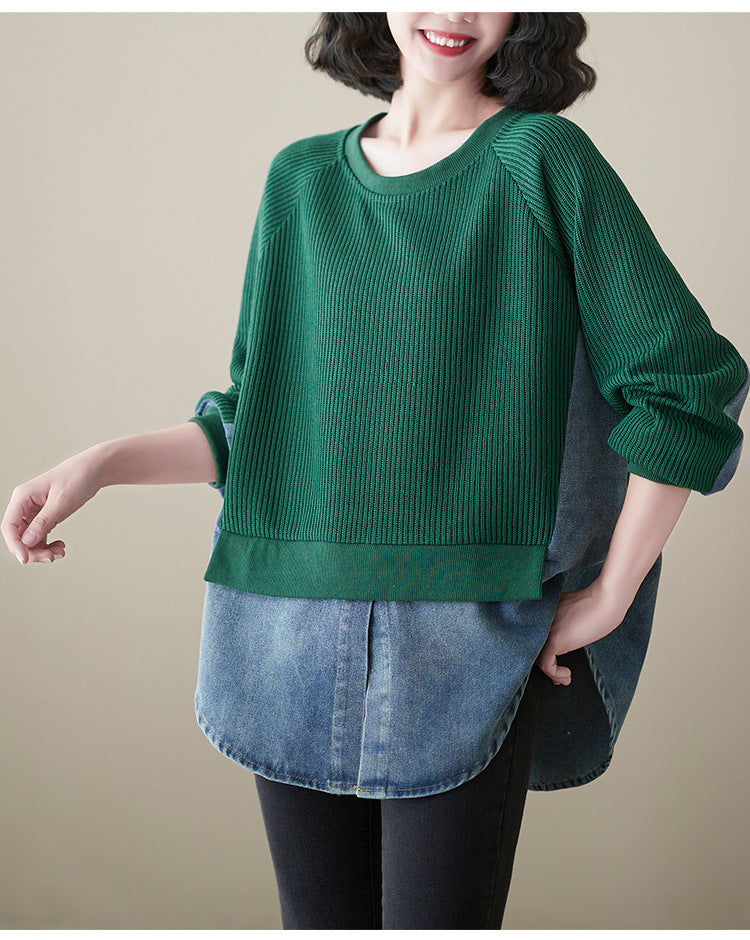 Loose Splicing Round Neck Long Sleeve Fake Two Pieces Sweater