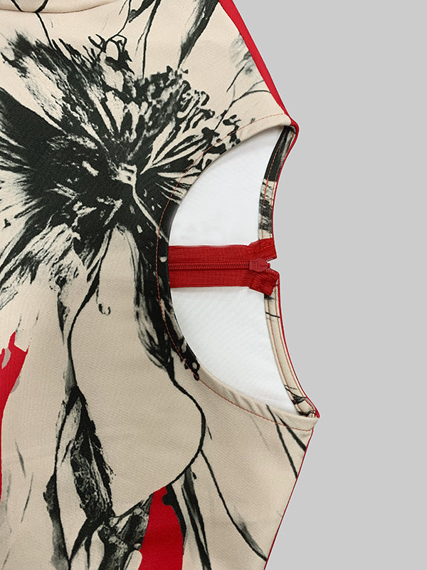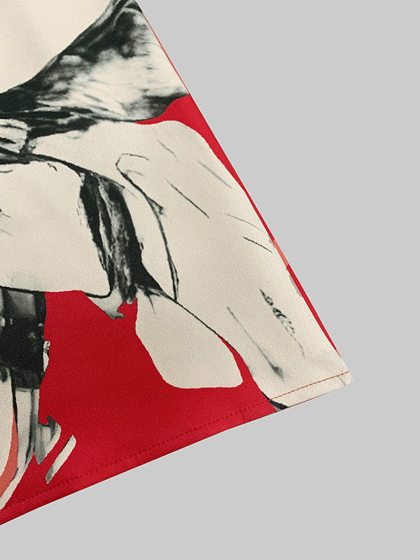 Loose Three-Quarter Sleeves Contrast Color Flower Print Round-Neck Midi Dresses