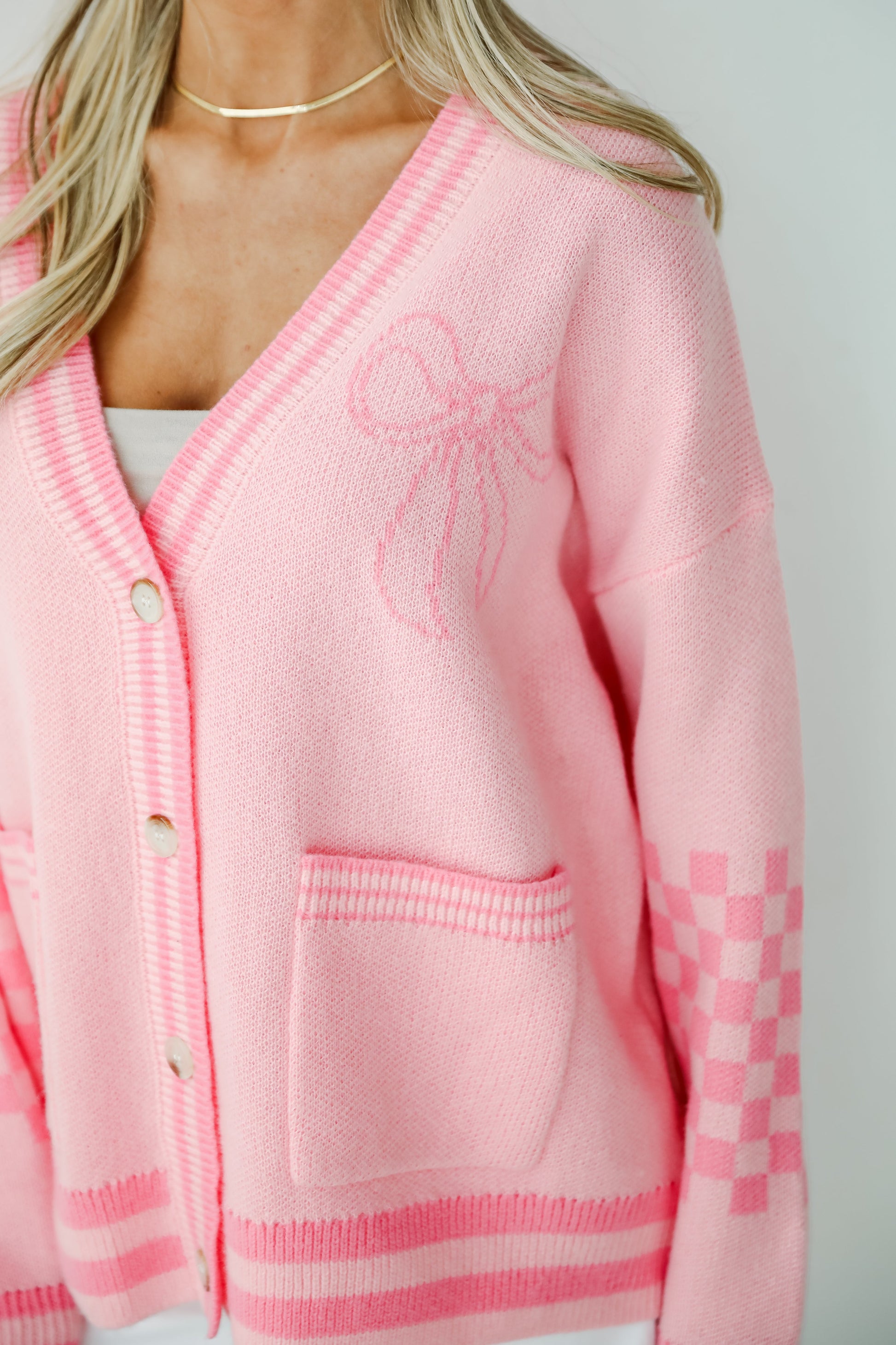 Reach for the Lovable Favorite Pink Bow Sweater Cardigan whenever you want to feel effortlessly cute! Featuring a cozy knit design. this cardigan stands out with its checkered print details and adorable bow accents for a touch of whimsy. The oversized fit ensures a relaxed and comfortable feel. while the button-front closure and ribbed trims add a classic finish. Perfect for pairing with jeans or over a dress. this cardigan is the ultimate combination of cute and cozy. making it a must-have for your wardrobe!