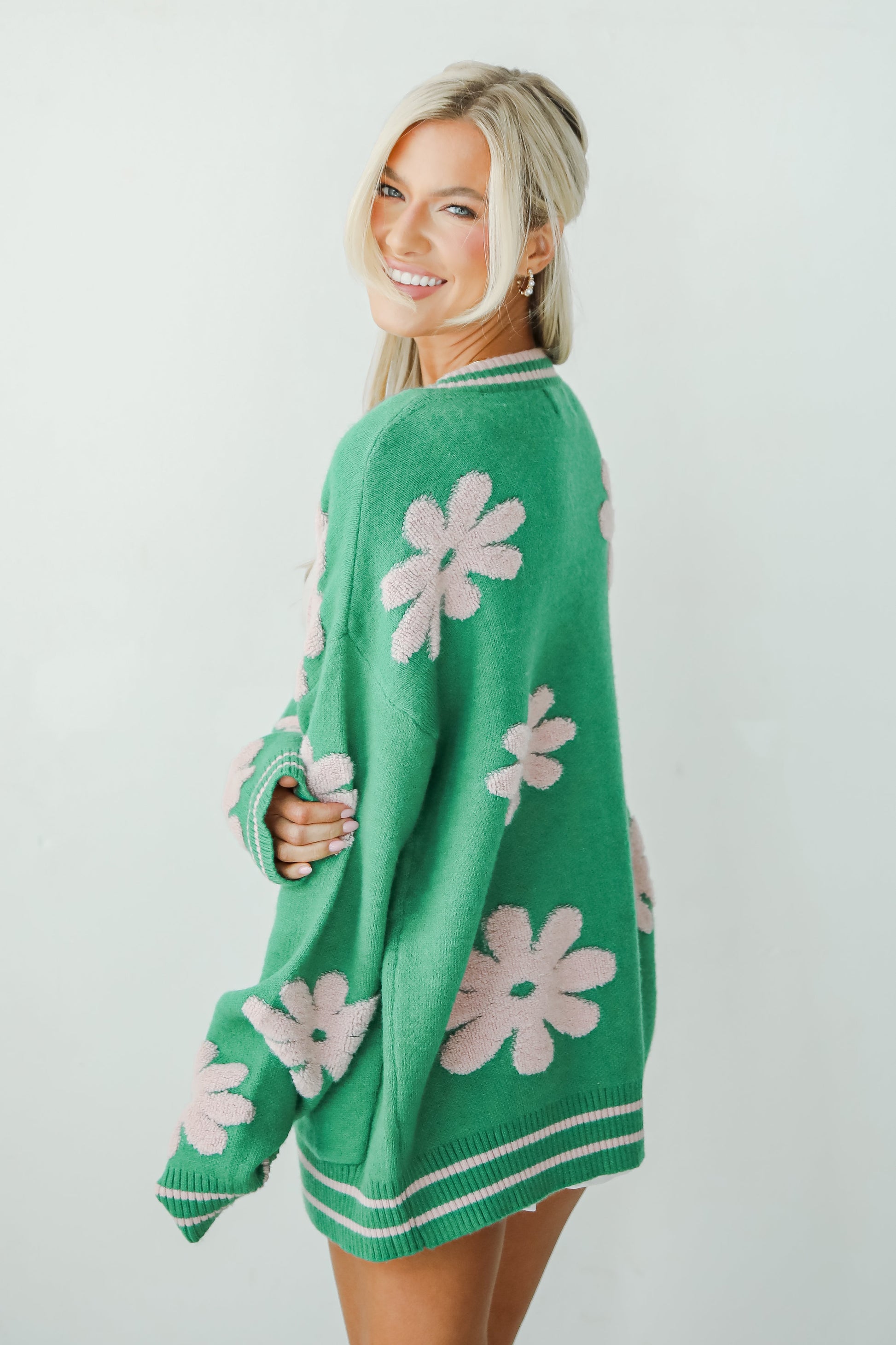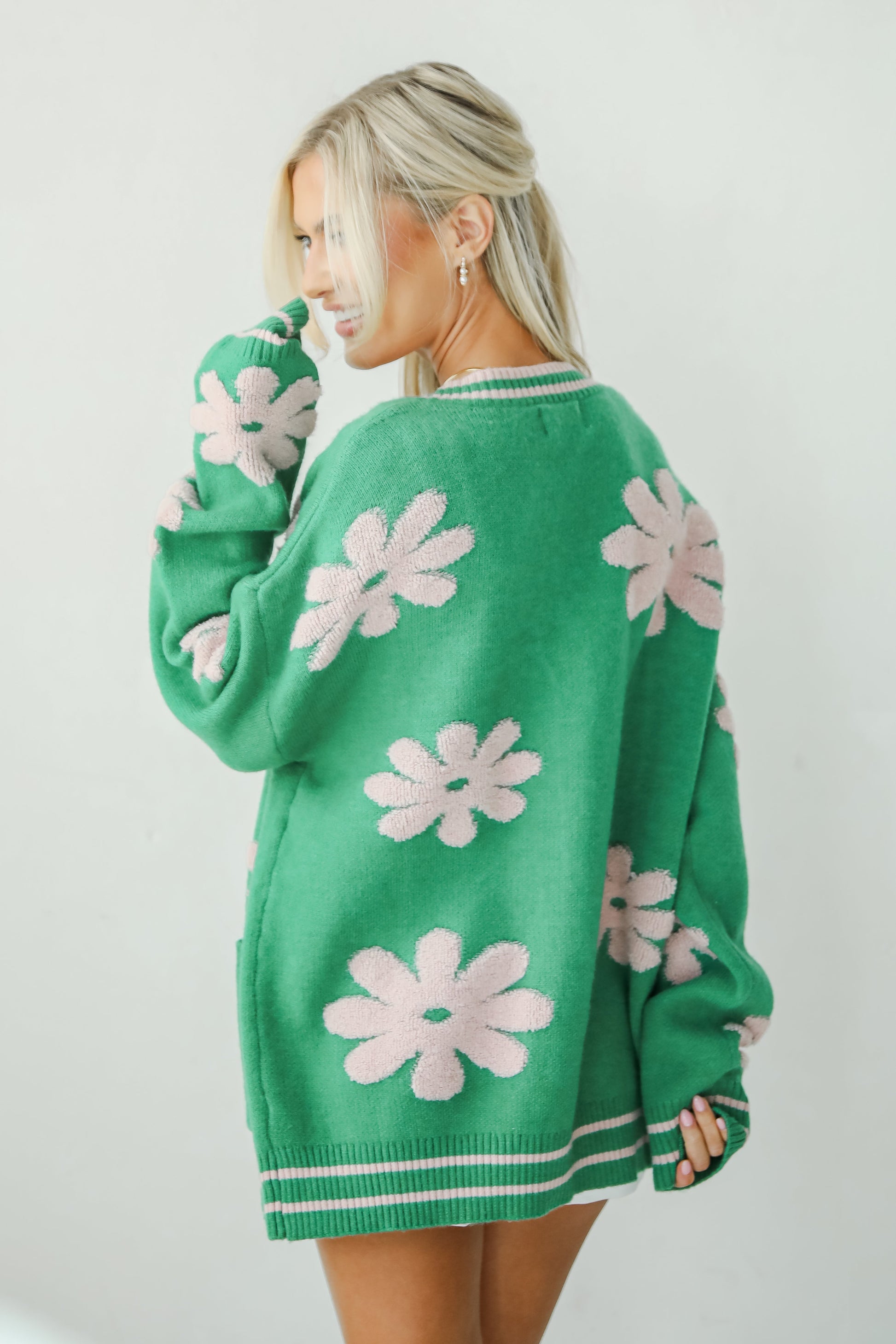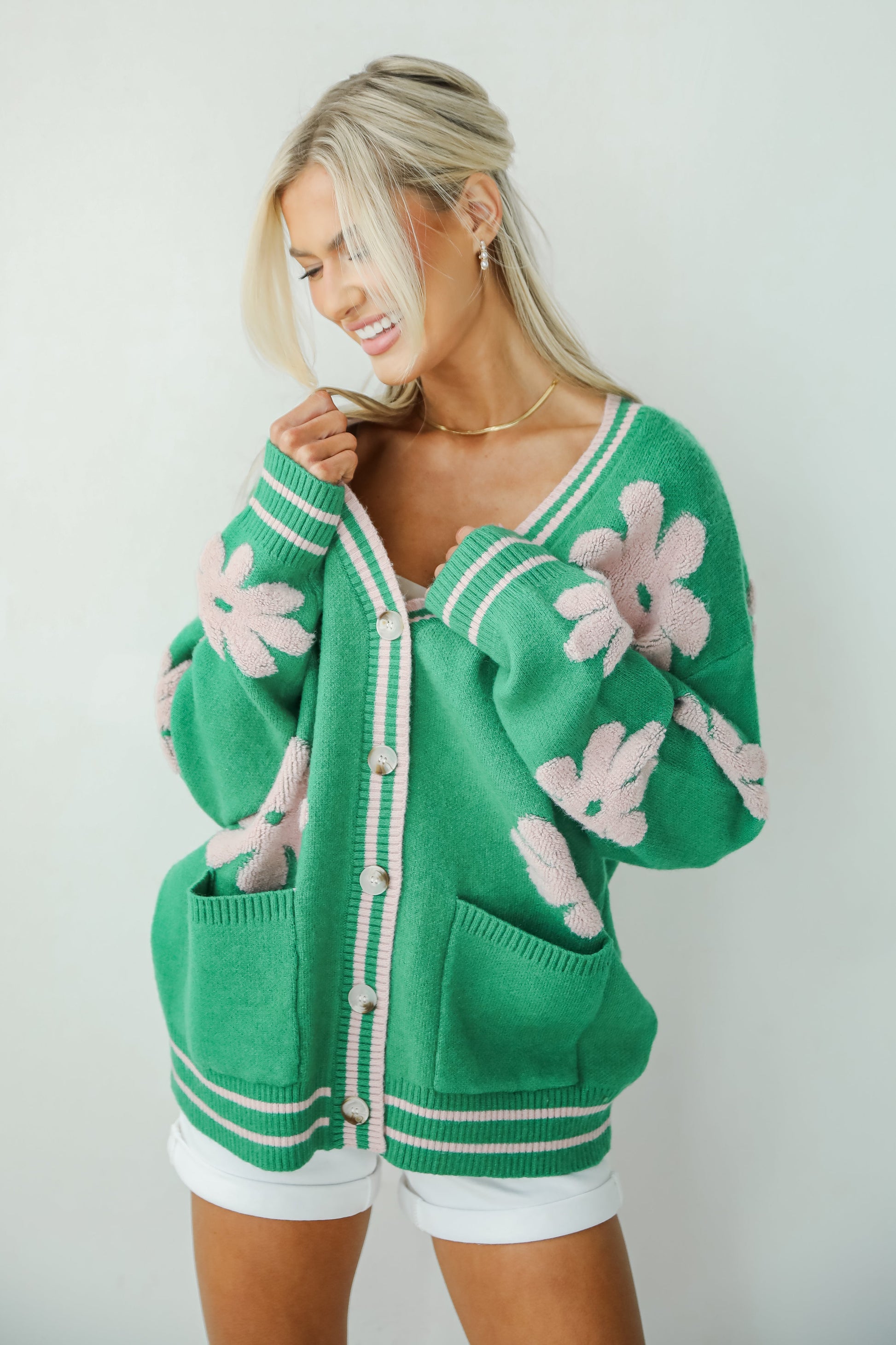 A chic pair of sunnies and the Luxe Cuteness Green Floral Sweater Cardigan will guarantee that you look compliment-worthy all season long! Designed with a cozy. relaxed fit. this cardigan features beautiful raised knit pink flowers scattered across the fabric. creating a charming. floral-inspired detail. The pink stripe accents along the edges and cuffs provide a playful contrast. making this piece truly stand out. With its button-up front and ribbed hems. it's both stylish and comfortable—perfect for layering over your favorite tops or dresses. Whether you're dressing it down for a casual day or elevating it for a cozy night out. this cardigan is a unique and versatile addition to your collection!