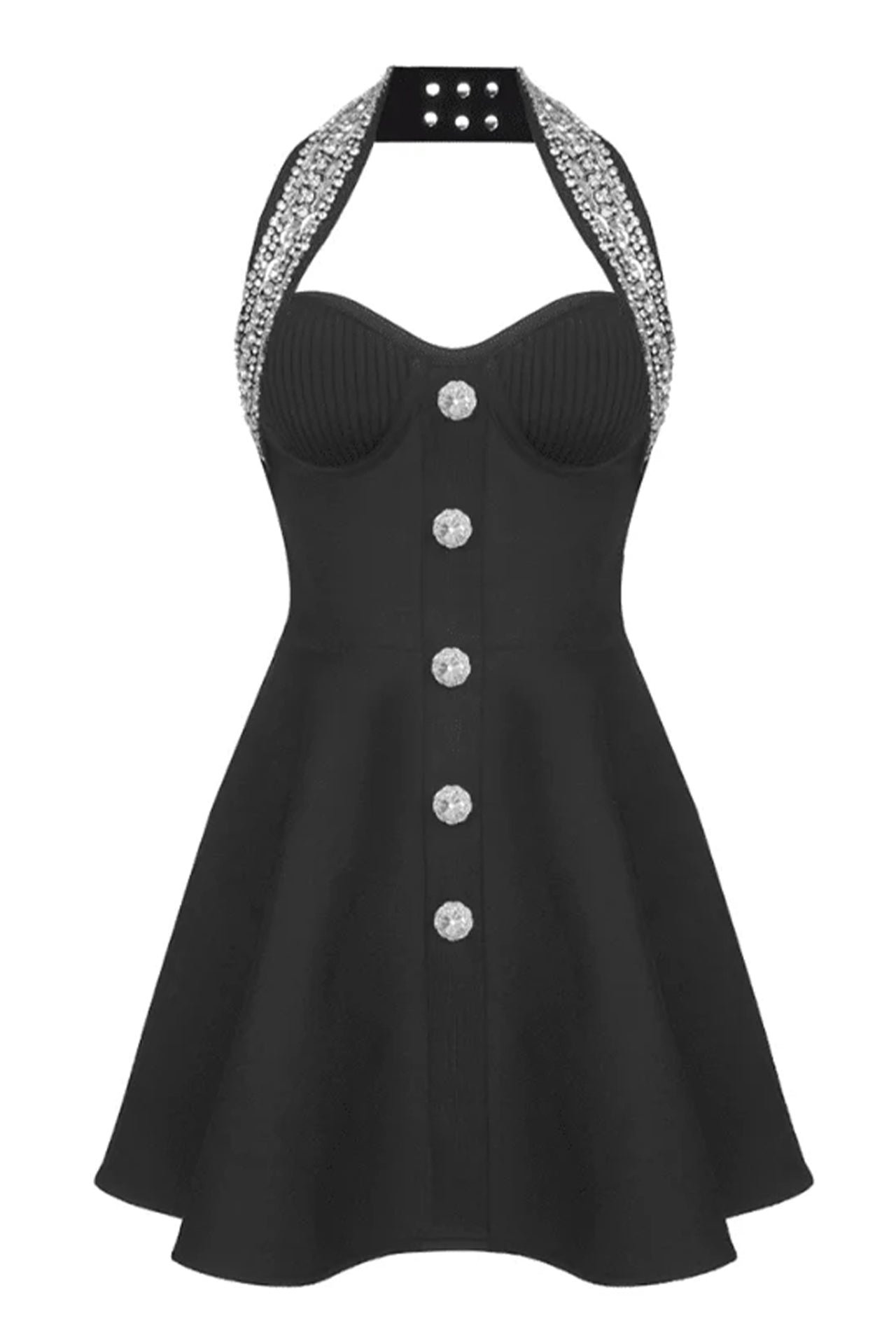 Indulge in luxury with our Lydia Halterneck Mini Dress In Black. The halter neckline accentuates your shoulders while the silver buttons and rhinestones on the neckline add a touch of elegance. Embrace your inner fashionista in this exclusive piece.