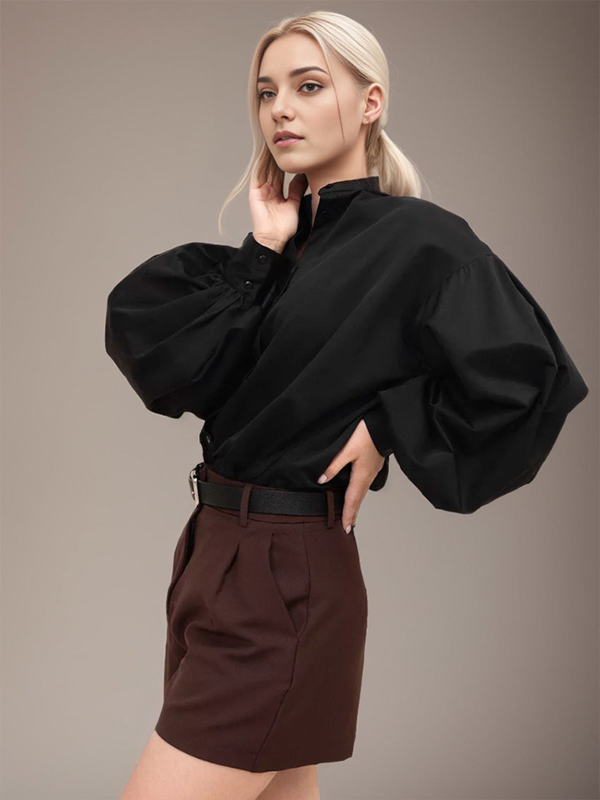 Minimalist Solid Color Lantern Sleeve Lapel Shirt