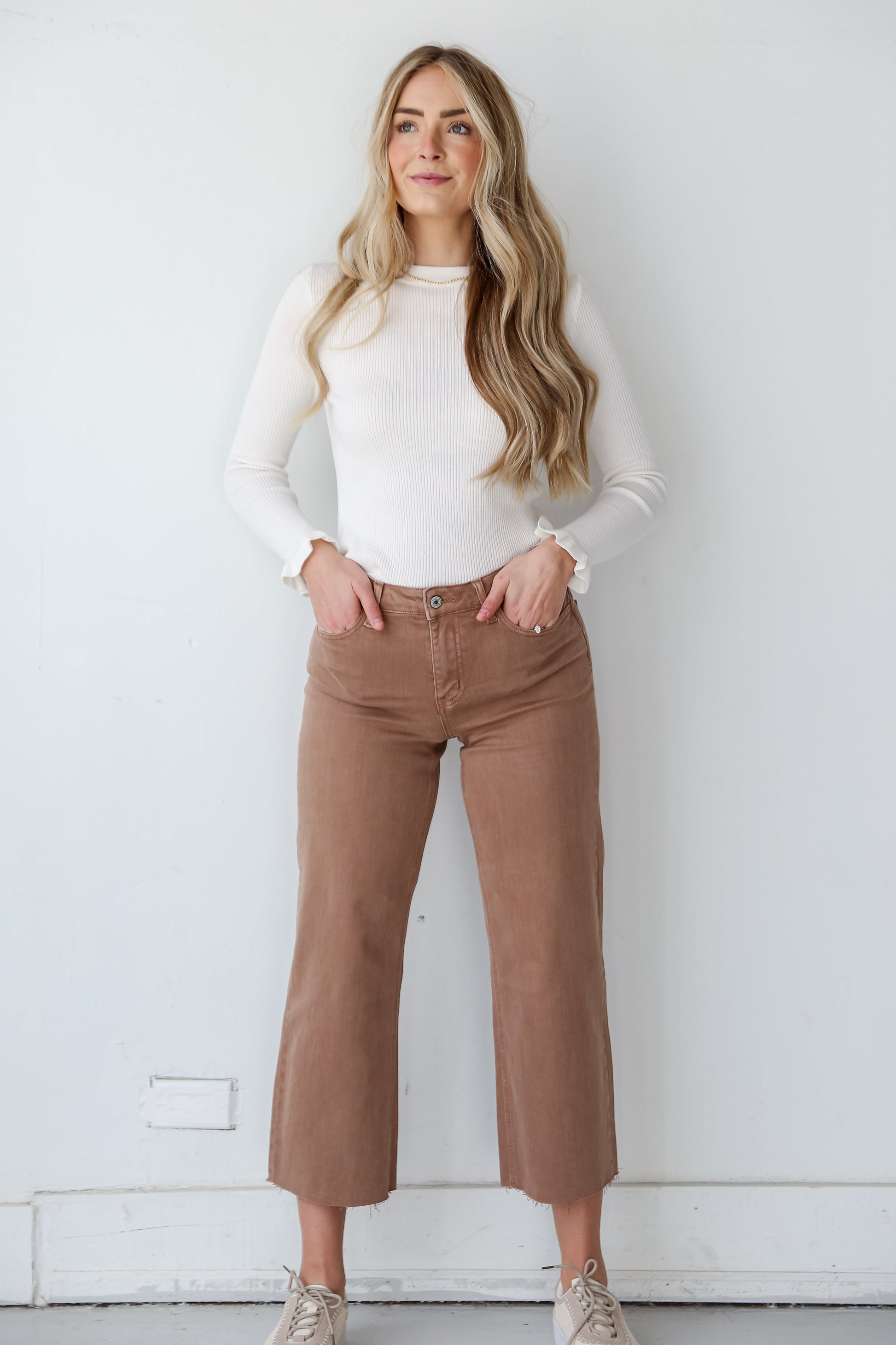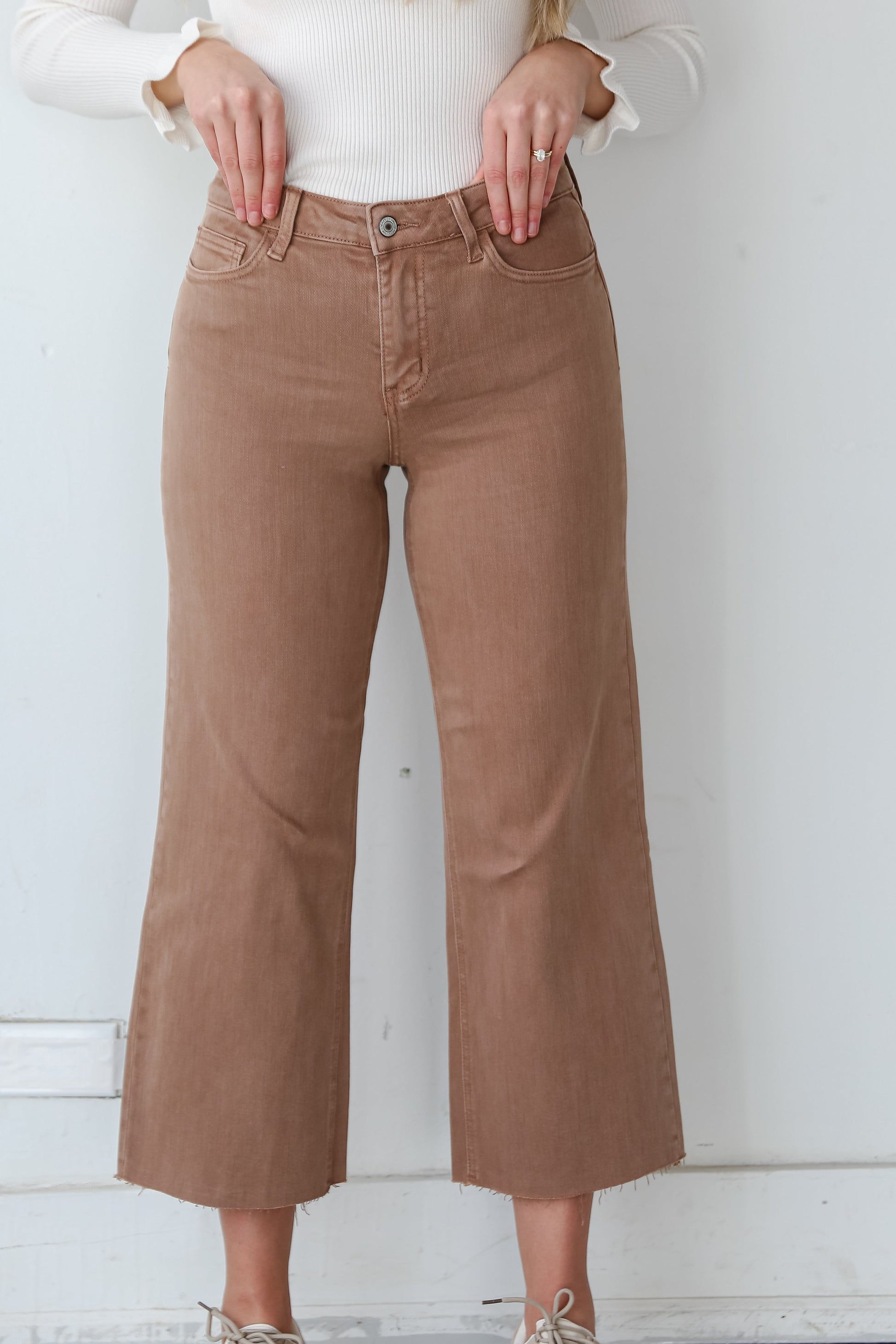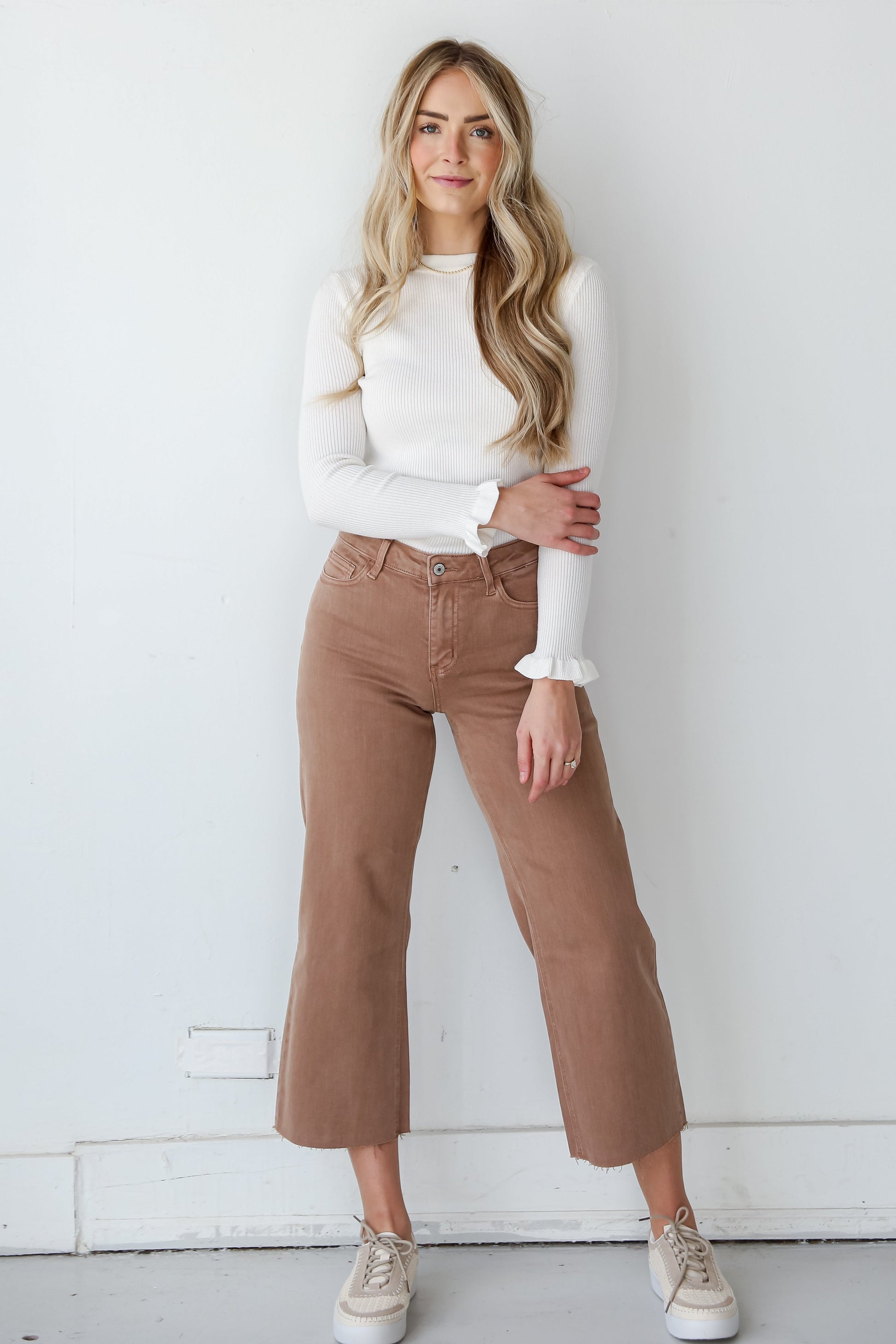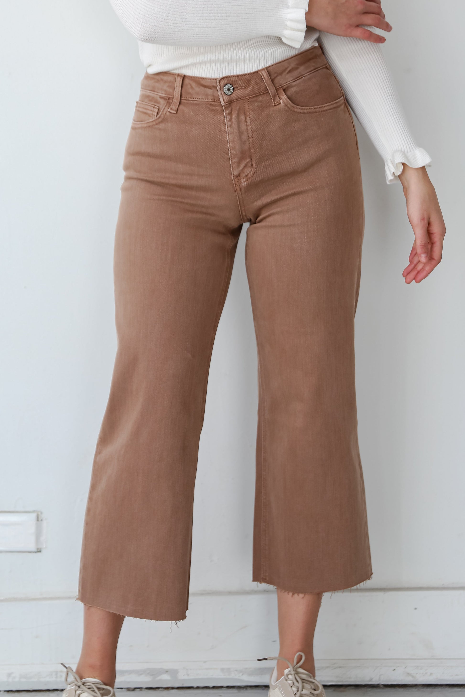 Introducing the Olivia Chocolate Brown Wide Leg Jeans �a sophisticated and versatile addition to your denim collection. designed for the modern woman who values both comfort and timeless style! These wide-leg jeans offer a contemporary silhouette in a rich chocolate brown hue. bringing a touch of elegance to your everyday wardrobe. Crafted from high-quality denim. these jeans provide a luxurious feel and a flattering fit. The wide-leg design adds a fashion-forward element. creating a chic and elongating silhouette. The deep chocolate brown color adds a sense of warmth and richness. making these jeans a standout choice for various occasions. Pair them with a tucked-in blouse for a polished look. or opt for a casual vibe with a cozy sweater �the possibilities are endless!