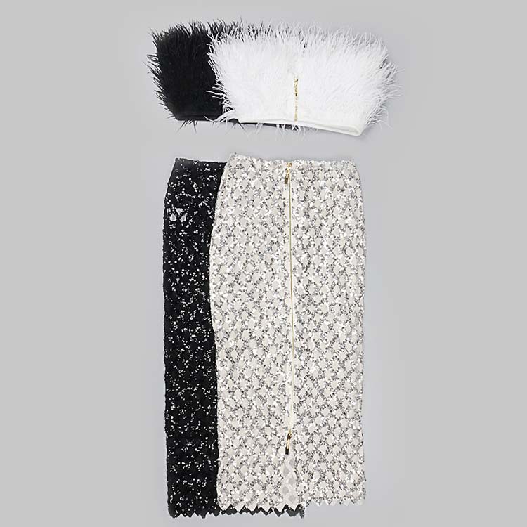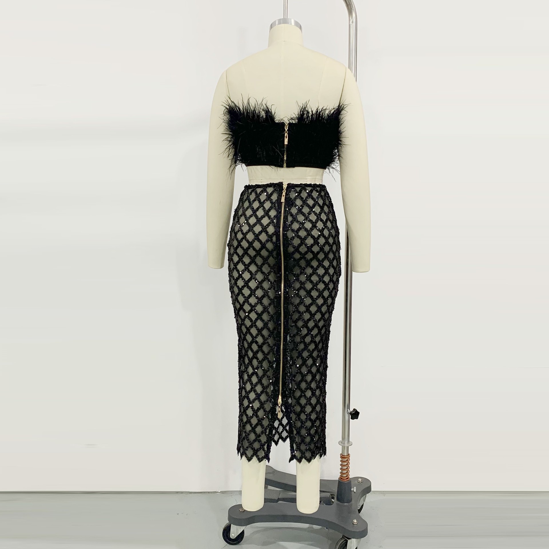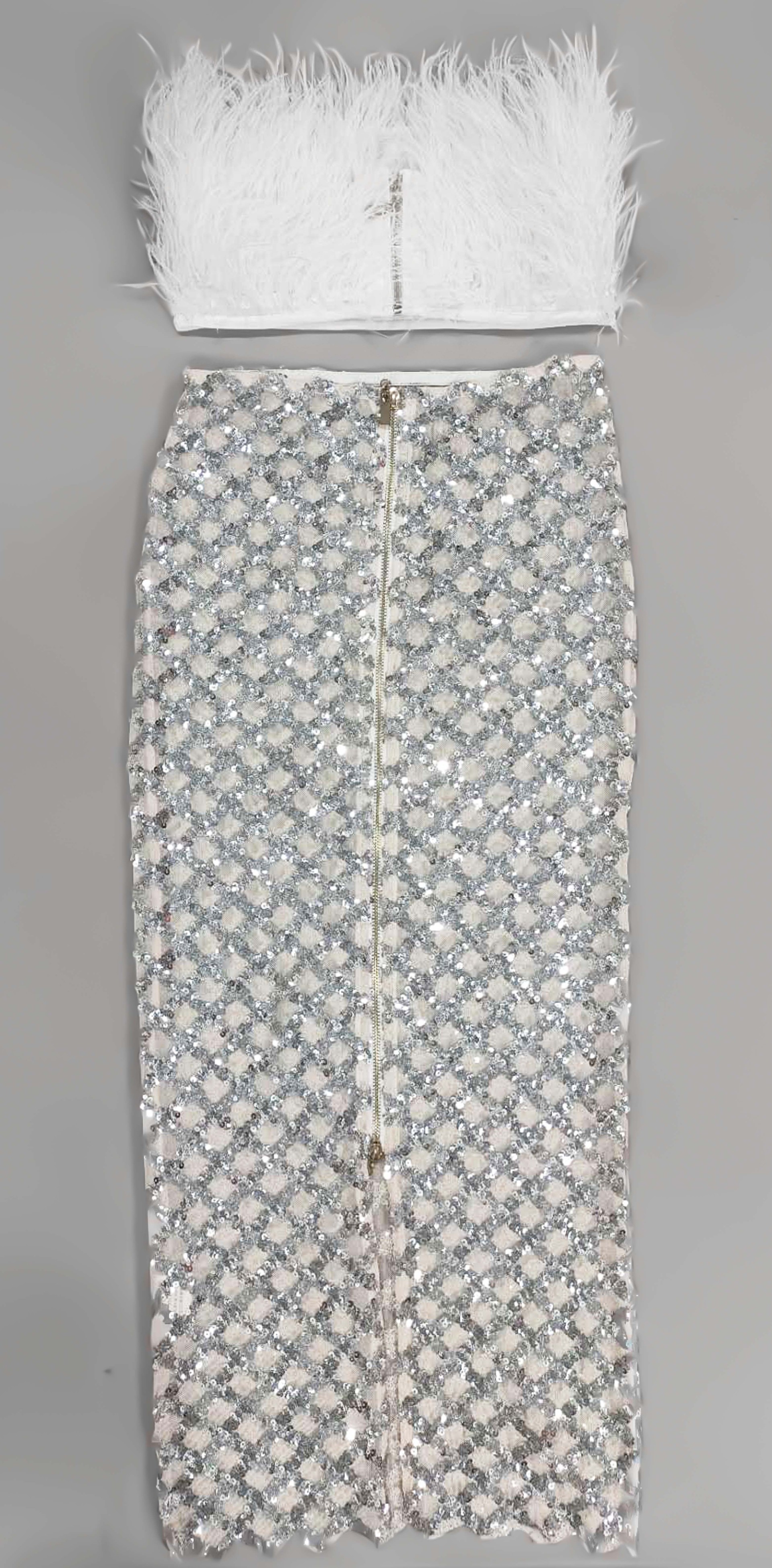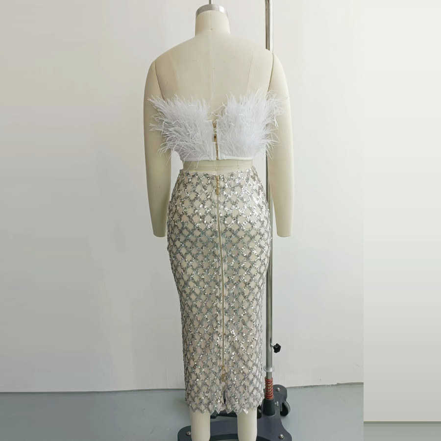 Ostrich Feather Top Silver Mesh Long Dress Suit Women Two-Piece Set