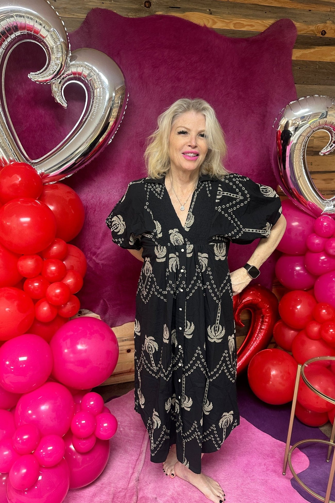 Elevate your style with our Oversized Textured V-Neck Palm Tree Print Dress. Crafted from light. breathable fabric for ultimate comfort. The classic V-neck and loose. oversized fit offer a chic and relaxed look. Available in a range of colors and sizes. Perfect for adding a touch of tropical glam to your wardrobe.