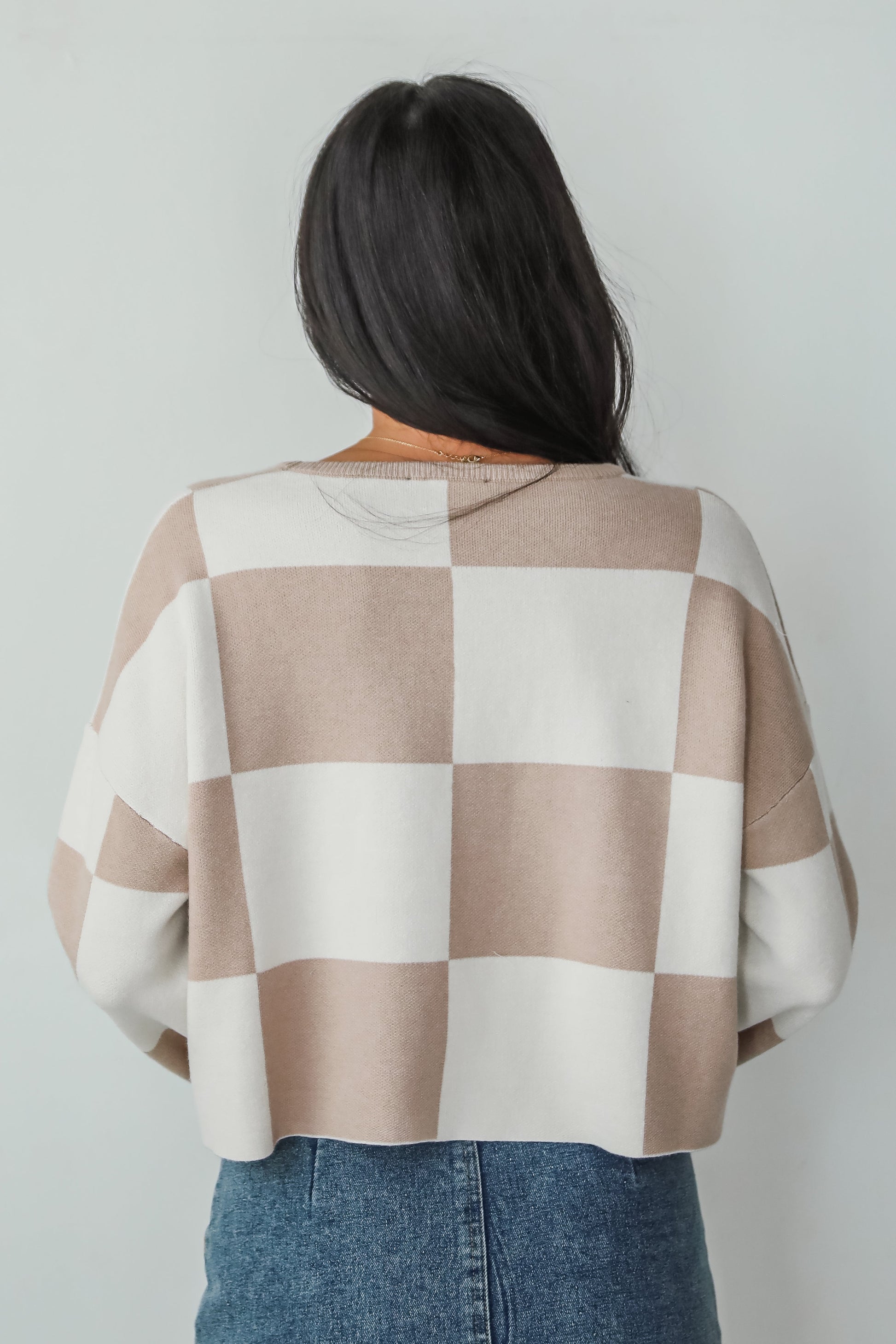Let everyone see you're a cutie in the Perfect Classic Taupe Checkered Cropped Sweater! Featuring a bold checkered pattern in soft taupe and ivory. this sweater strikes the perfect balance between classic and contemporary. The cropped fit gives it a modern. flattering silhouette. making it perfect for pairing with high-waisted jeans. skirts. or leggings. Crafted from soft. comfortable fabric. it's perfect for layering on cooler days or wearing solo for a chic. casual look. Whether you're dressing up or down. this versatile sweater is a must-have for effortless style!