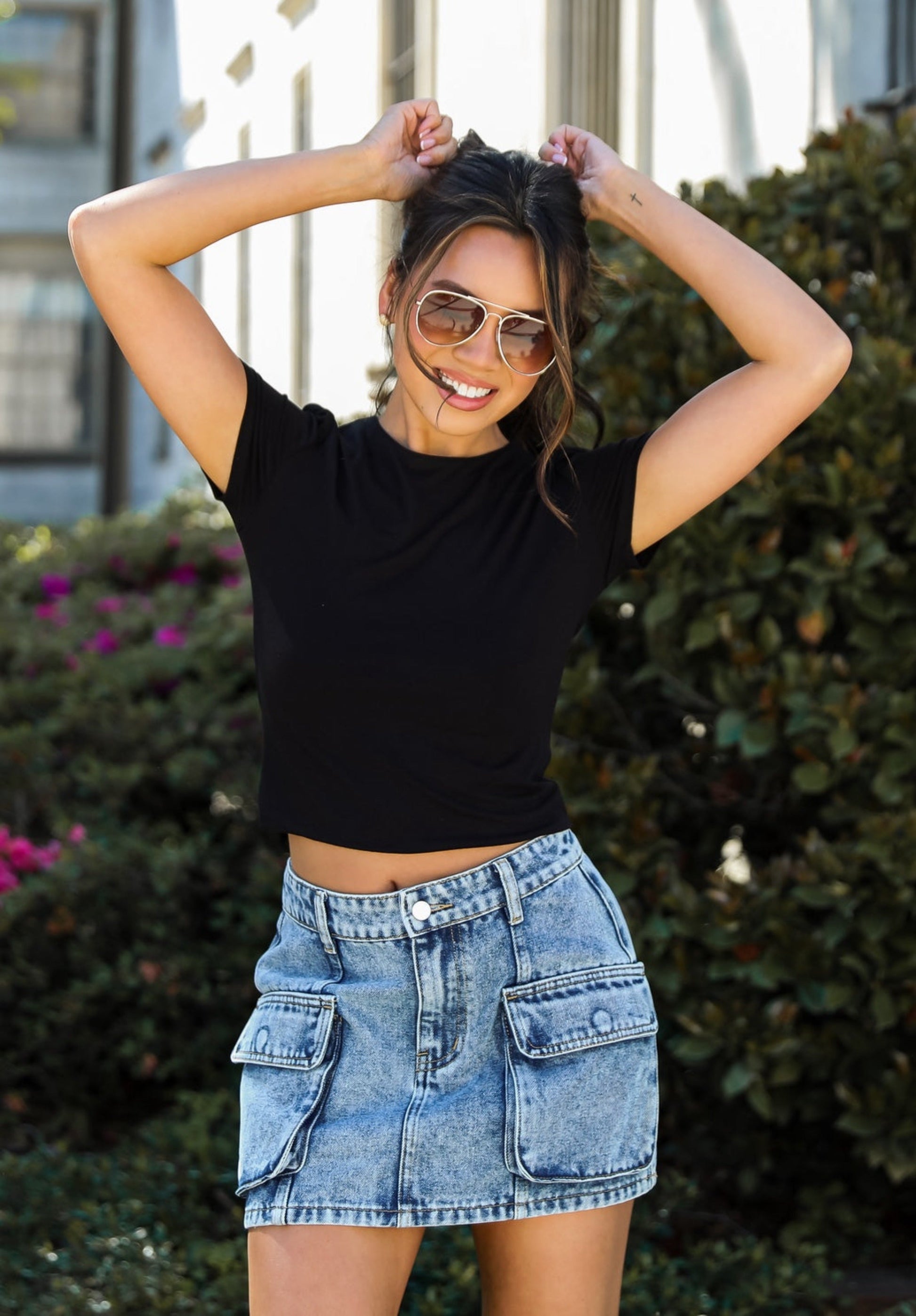 You're not just following the trends. you're setting them with the Roll With It Denim Mini Skirt! Crafted from durable denim fabric. this skirt offers both comfort and versatility for any occasion. The timeless design features a flattering high waist and a sleek A-line silhouette. accentuating your curves while providing a chic and effortless look. Whether you're headed to a casual brunch or a night out with friends. this denim mini skirt is sure to be your new favorite go-to piece. The versatile denim fabric pairs perfectly with everything from graphic tees to blouses. making it easy to dress up or down depending on the occasion!
