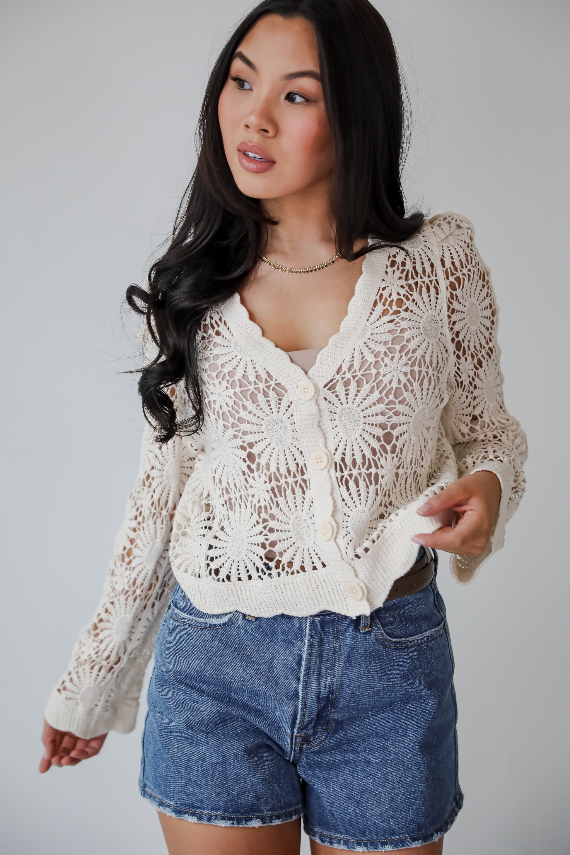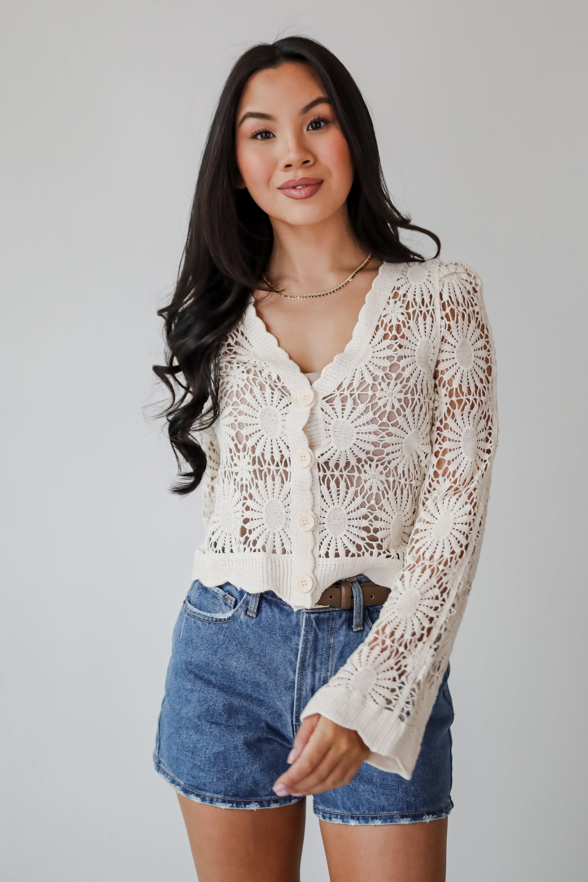 If there's one thing we always bring on vacay. it's the Seeking The Sun Natural Crochet Top! Crafted from a soft. breathable yarn. this top features an intricate crochet design that adds a relaxed. airy feel to any outfit. The open knit provides a lightweight. comfortable fit. while the button-front closure allows for versatile styling—wear it buttoned up or layered over a tank for a more casual look. Whether paired with denim shorts for a sunny day or wide-leg trousers for a laid-back evening. this crochet top is a chic and versatile addition to your collection!