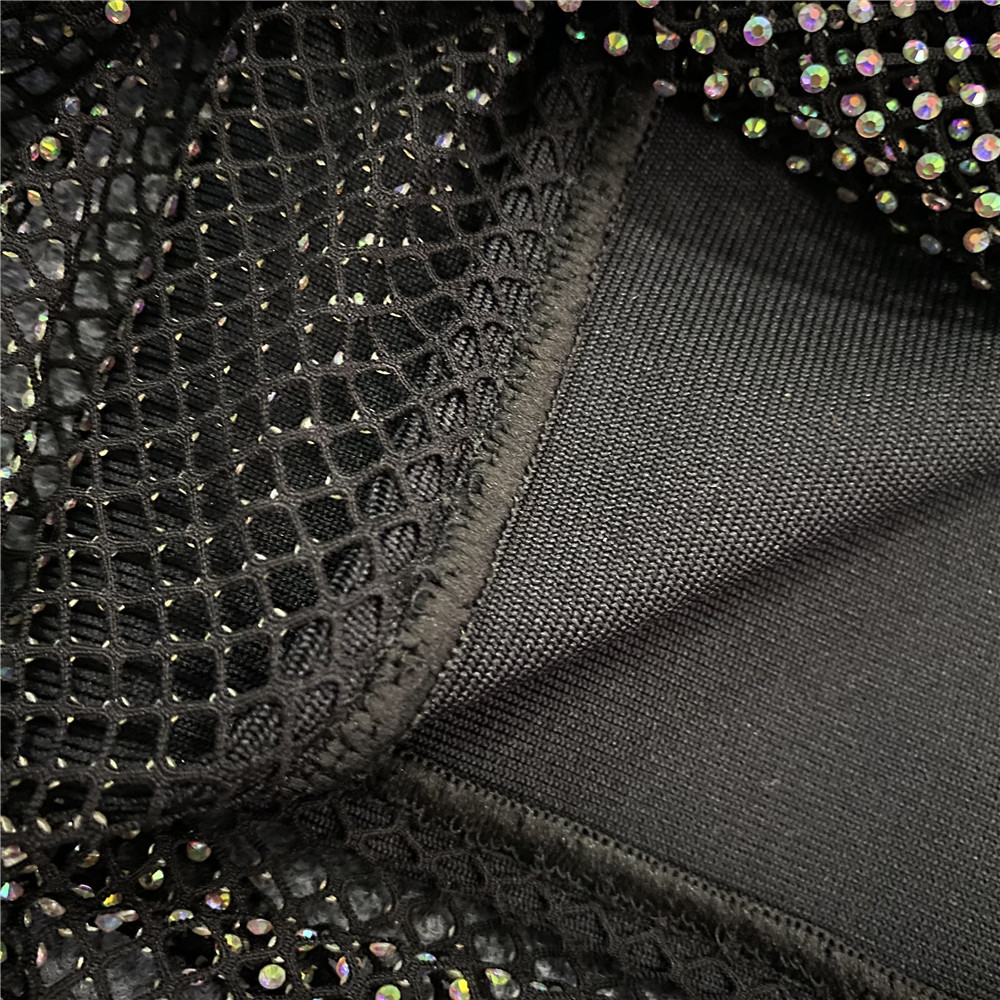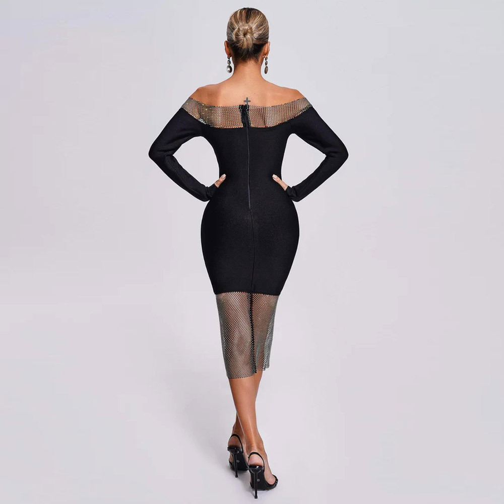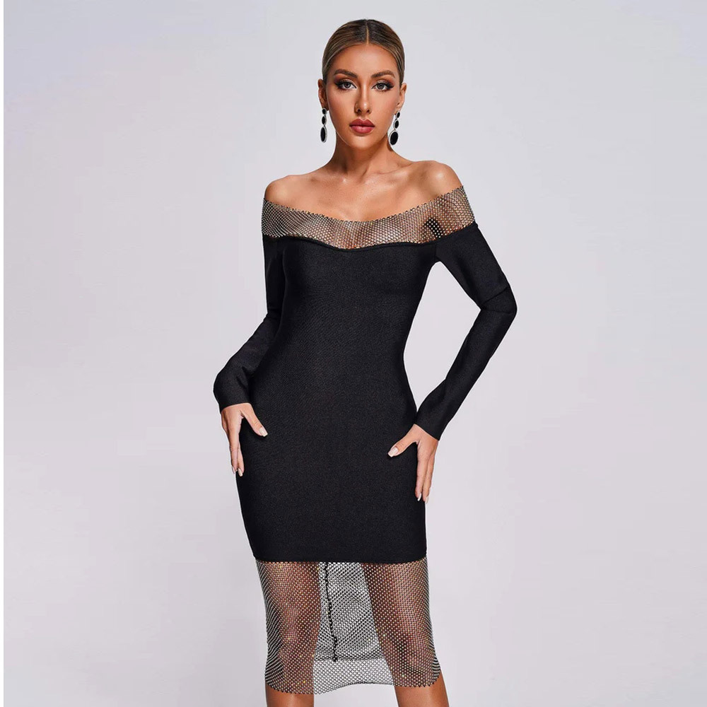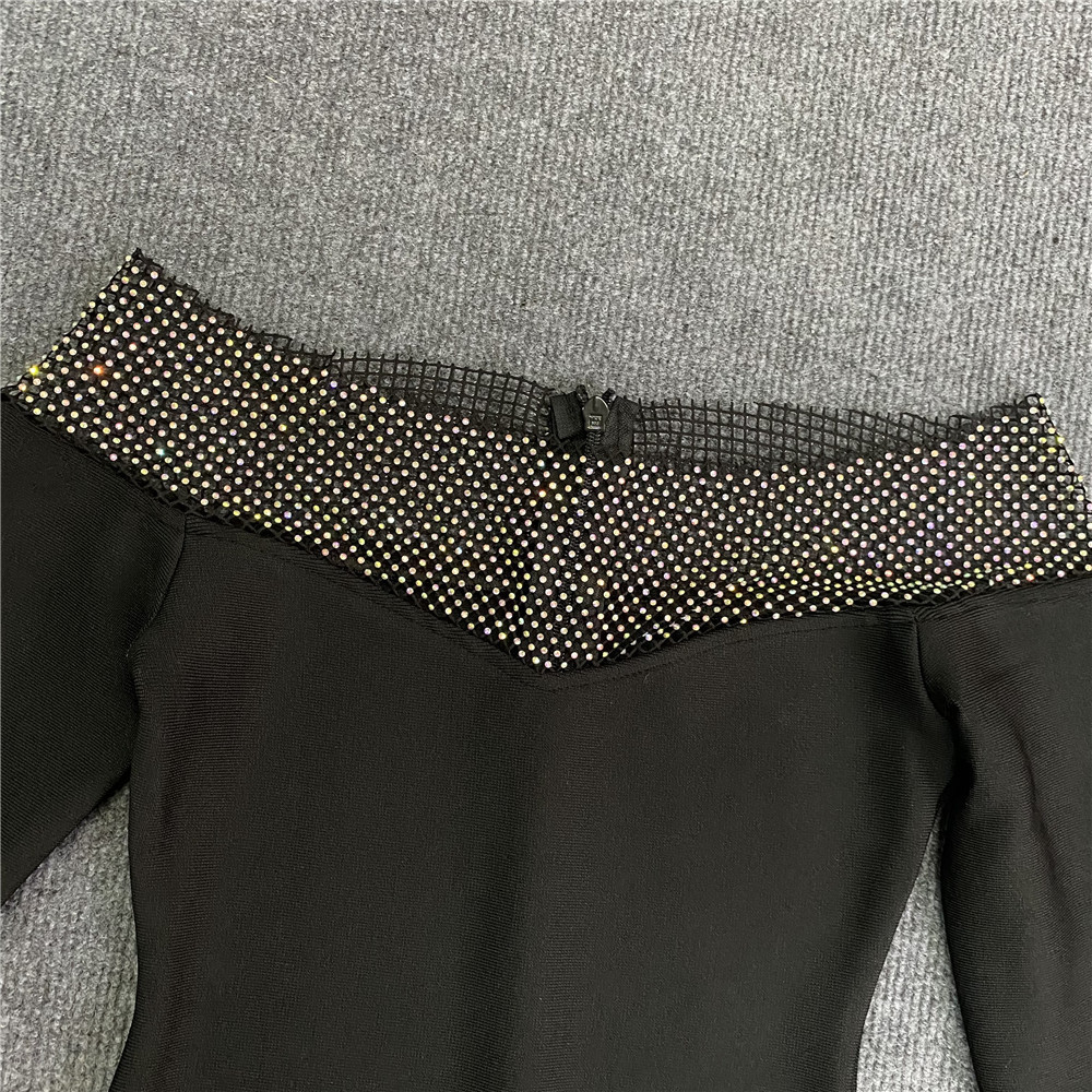 Sexy Off-The-Shoulder Long Sleeve Mesh Diamond Dress Slim Bandage Party