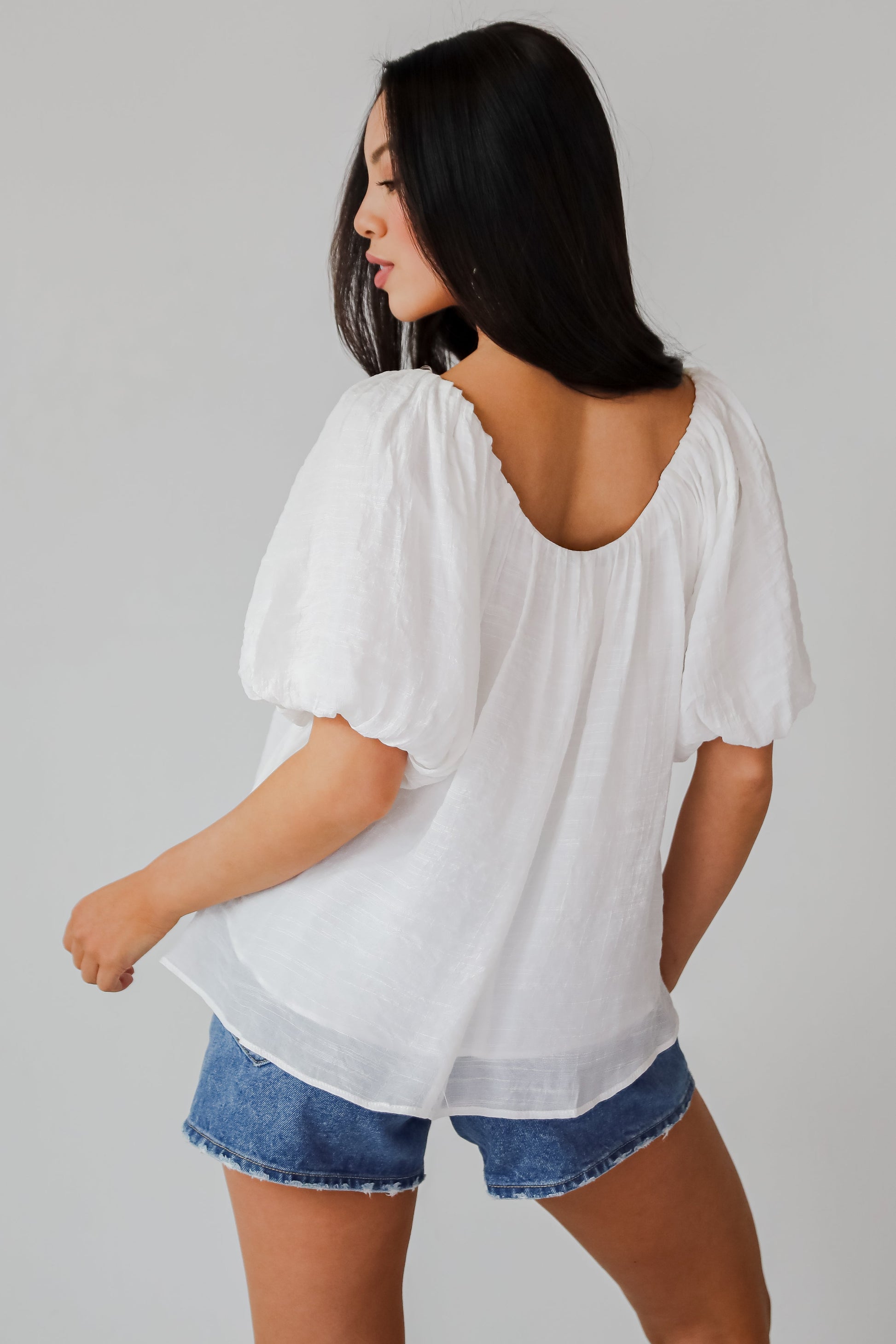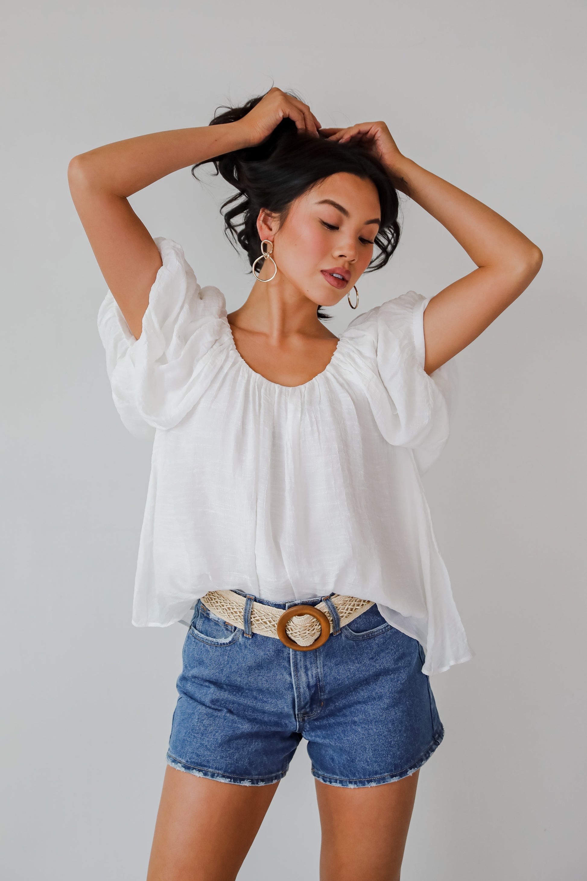 You'll look oh-so-cute with the snap of a finger when you slip on the Simply Pretty White Puff Sleeve Blouse! Featuring voluminous puff sleeves. this blouse combines modern style with classic femininity. creating a flattering silhouette. The crisp white fabric adds a clean. fresh look. perfect for pairing with everything from high-waisted jeans to tailored trousers. With its subtle round neckline and slightly relaxed fit. this blouse can easily transition from day to night—whether you're dressing it up with heels or keeping it casual with sneakers!