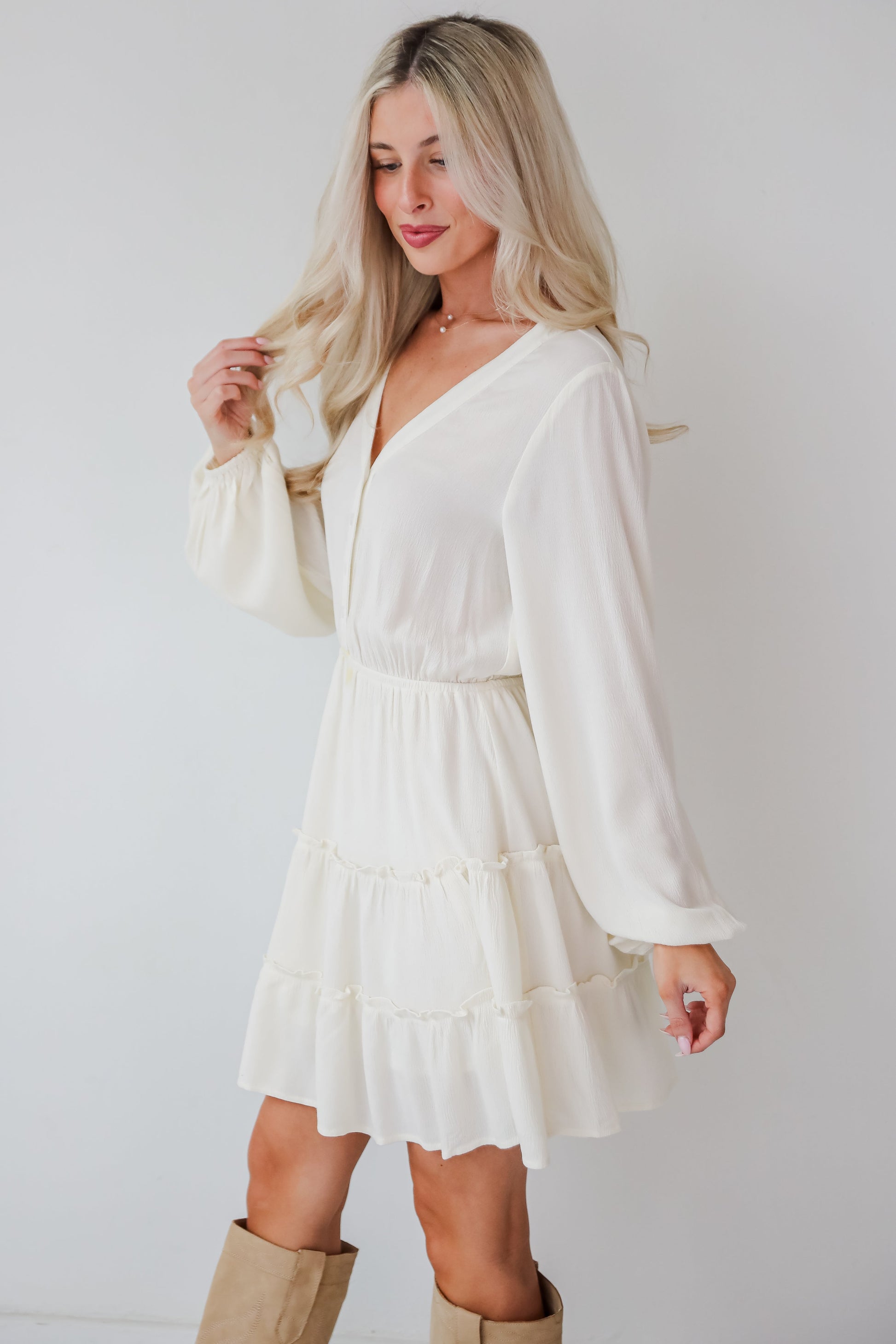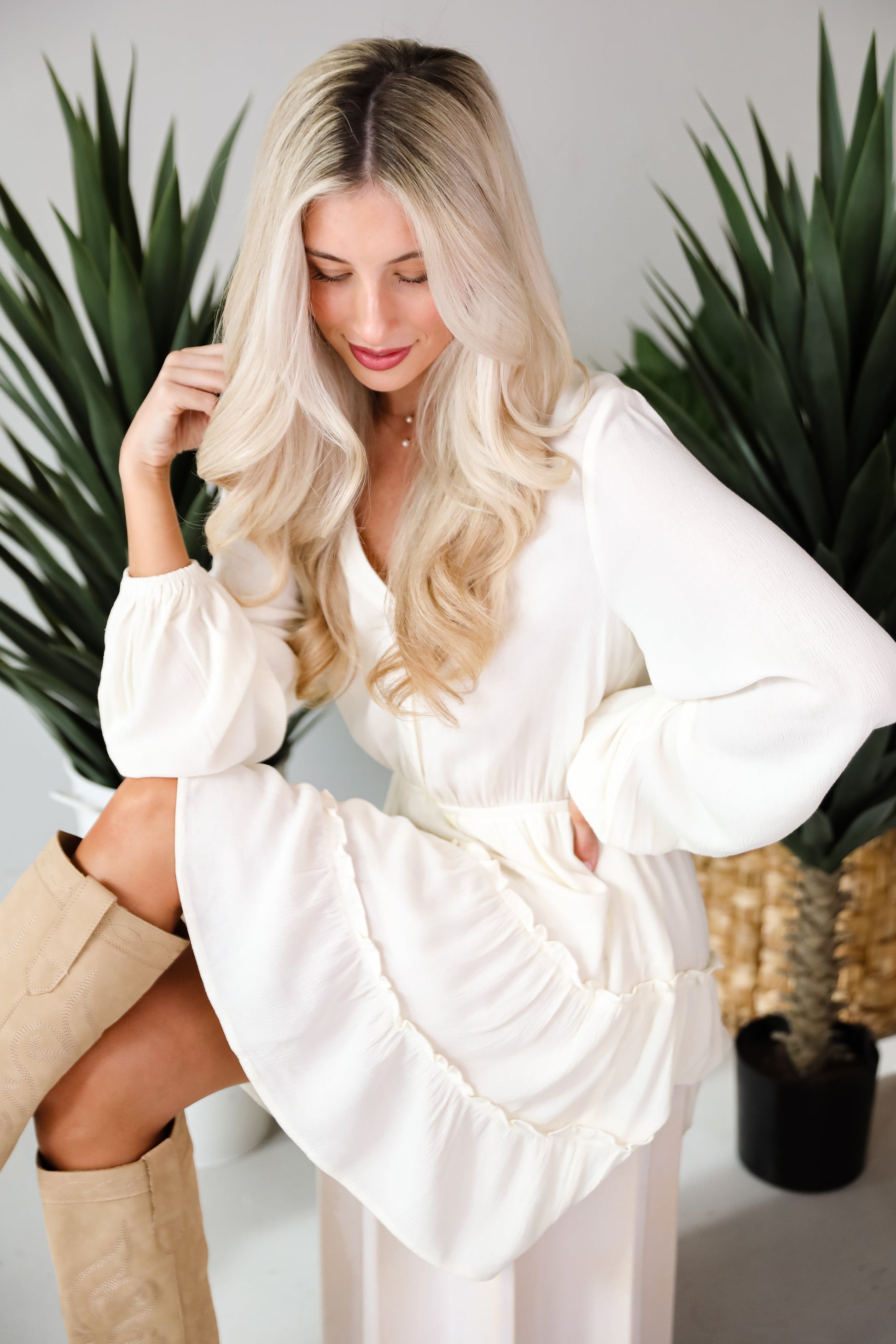 The sweetest vibes come easy whenever you style the Sincere Charisma Ivory Tiered Mini Dress! Designed with delicate ruffle tiers throughout. this dress creates a soft. flowing silhouette that moves beautifully with every step. The long sleeves add a touch of sophistication. while the mini length keeps it fresh and youthful. Crafted from a lightweight. breathable fabric. it's perfect for both day and evening occasions. Whether paired with heels for a dressy look or ankle boots for a more casual vibe. this versatile dress is a must-have addition to your wardrobe!