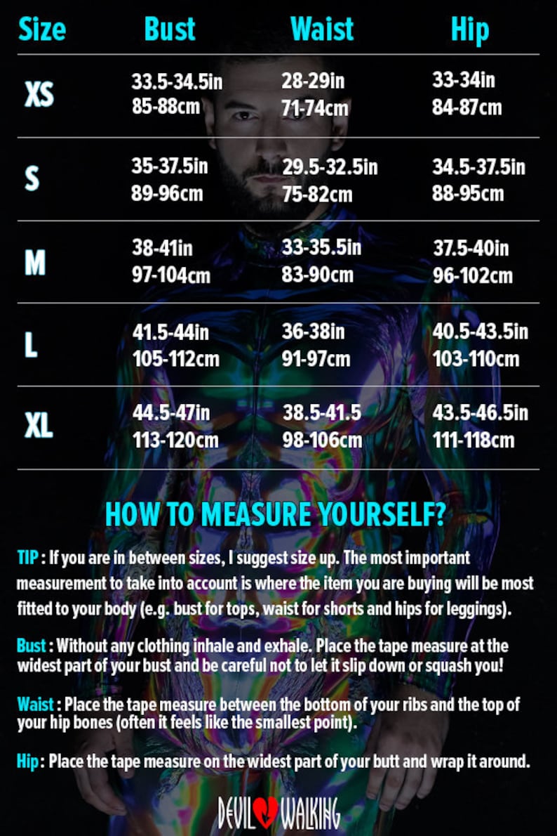 Our devil is 5'11”/180cm. 176lbs/80kg. and wears size Medium (M).