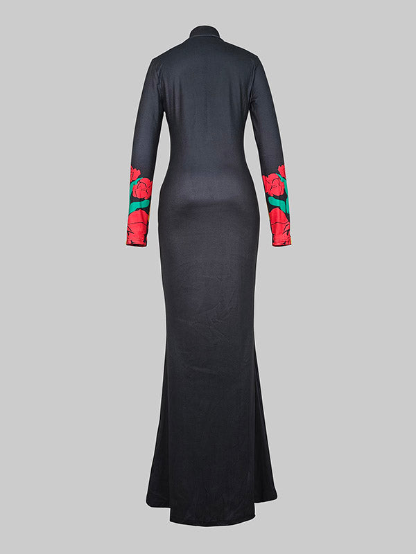 Skinny Flower Print Multi-Colored High Neck Maxi Dresses