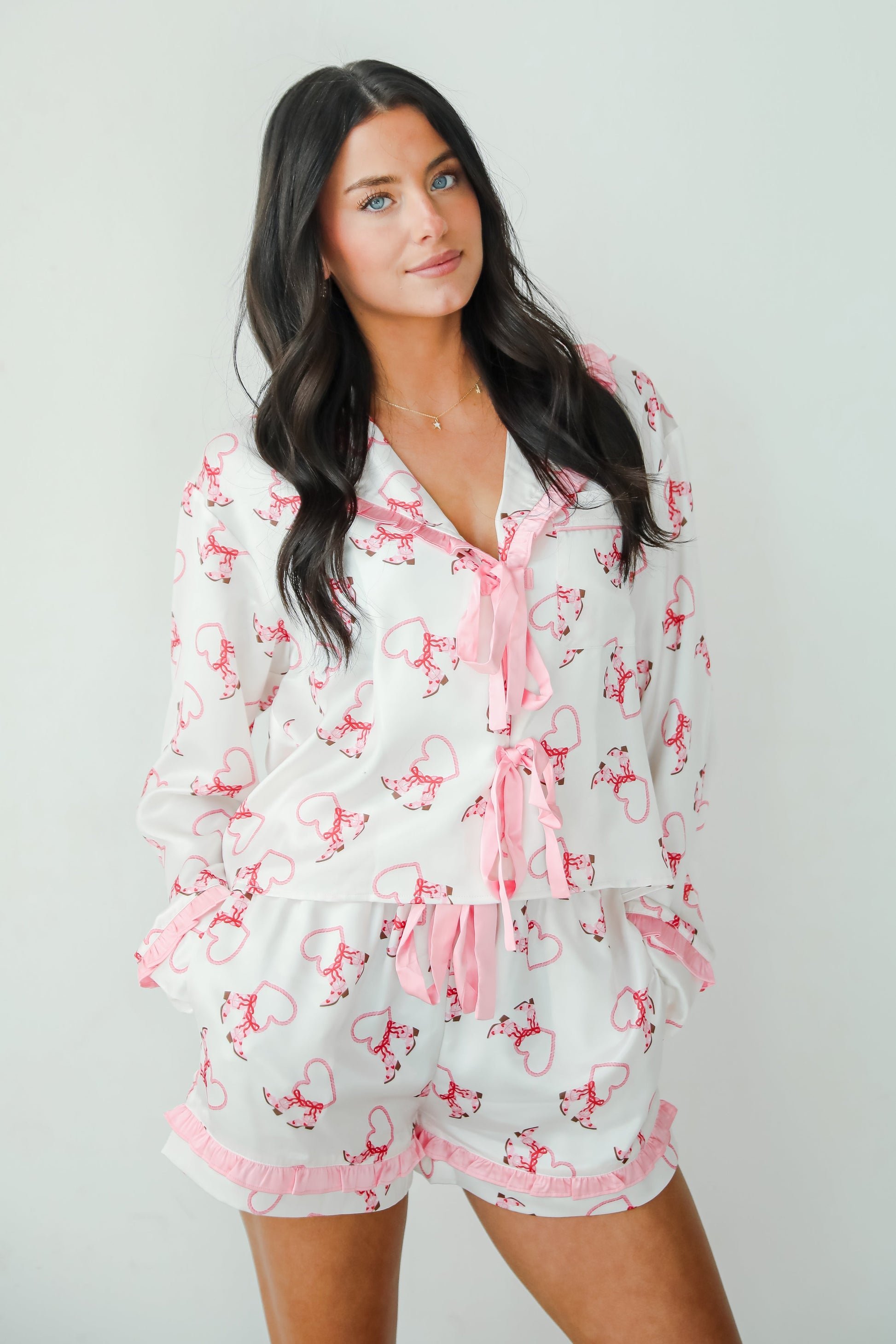 When it comes to dreaming. all we can think about is how cute the Slumber Party White Western Heart Pajama Top is! Crafted from soft. silky satin. this top offers a smooth. luxurious feel perfect for a cozy night in or a peaceful sleep. The button-down front adds a classic touch. while the whimsical design brings a lighthearted. feminine charm. Pair it with the matching shorts for a coordinated look that's both stylish and comfortable. Whether you're unwinding after a busy day or lounging in style. this top is sure to add a touch of fun to your evening routine!