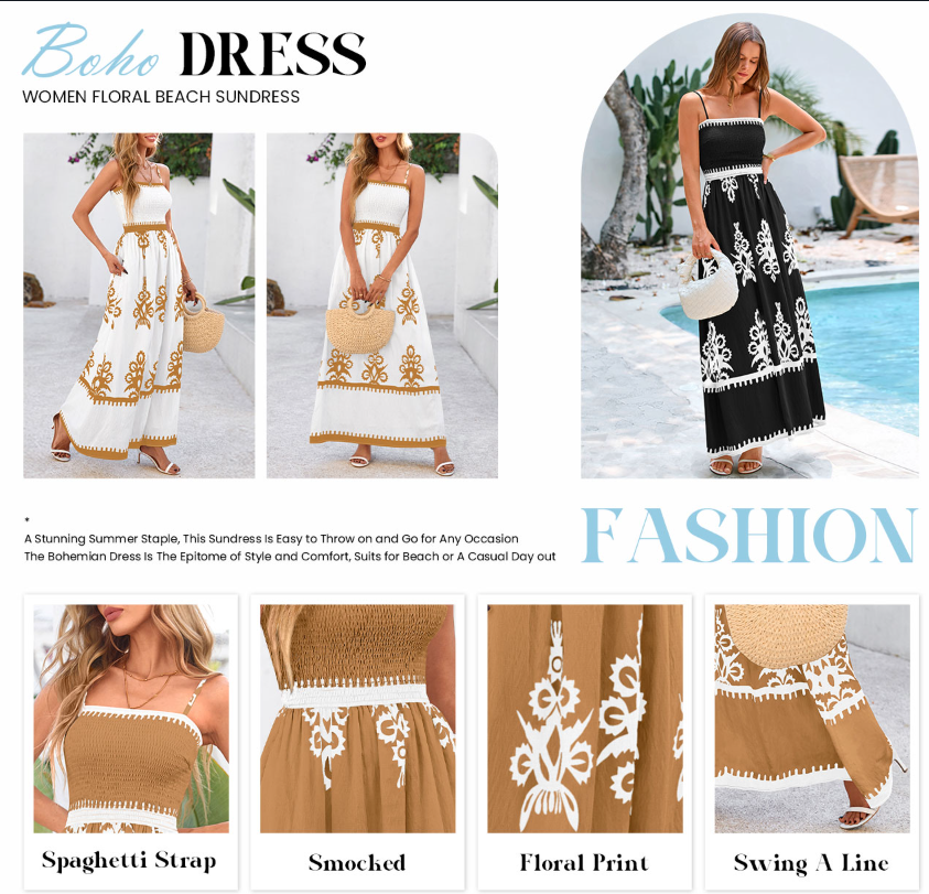 Elevate your style with our Spaghetti Strap Ruffled Floral Bohemian Maxi Dress With Pockets. Featuring a flattering shoulder line. pleats. and vibrant floral patterns. this dress exudes bohemian charm. Its loose. flowing design and convenient pockets make it perfect for any occasion.
