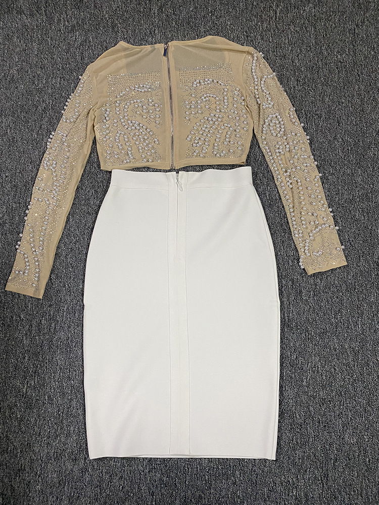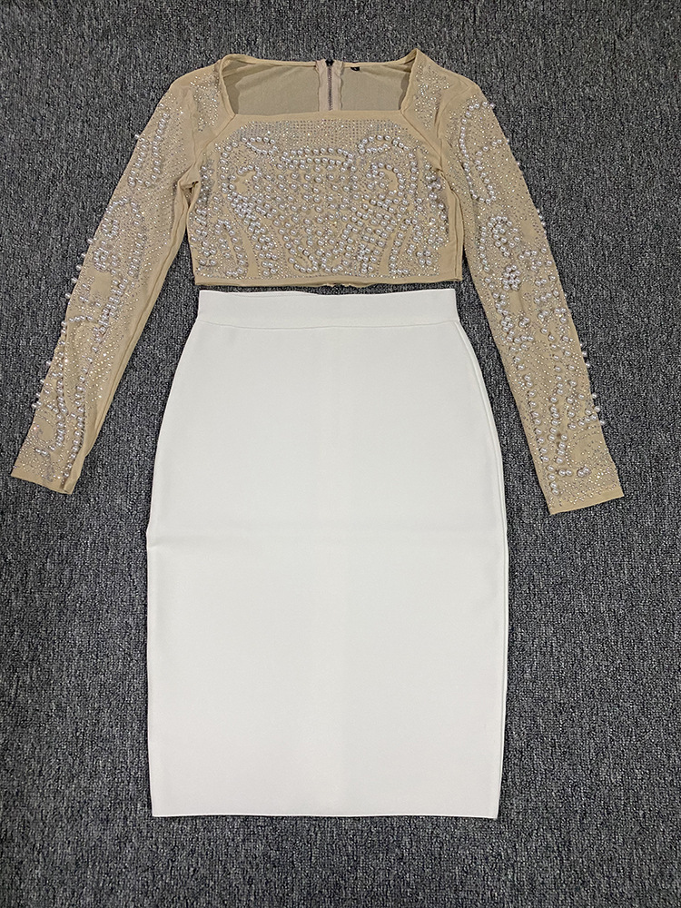 Square Collar Long Sleeve Beaded Top Slim Bandage Skirt Two-Piece Suits