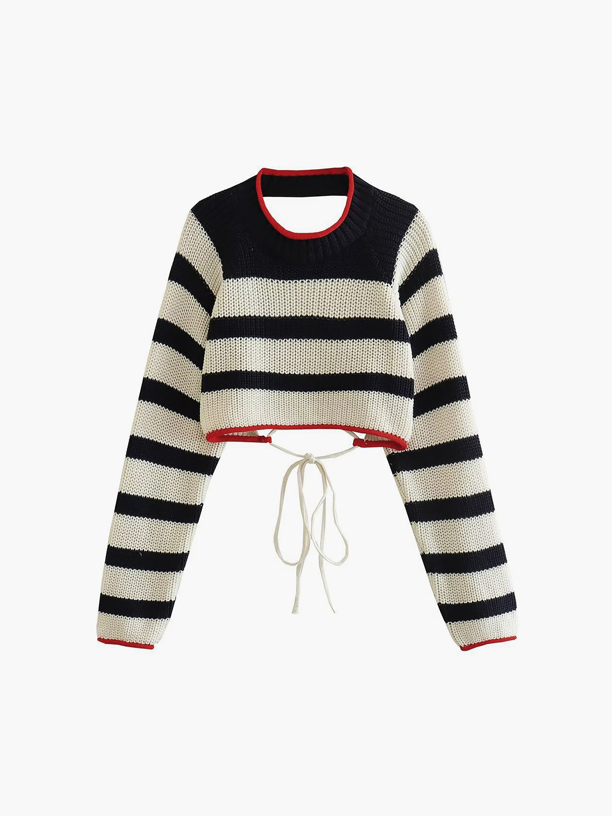 Stripe Crochet Long Sleeve Open Back Crop Top