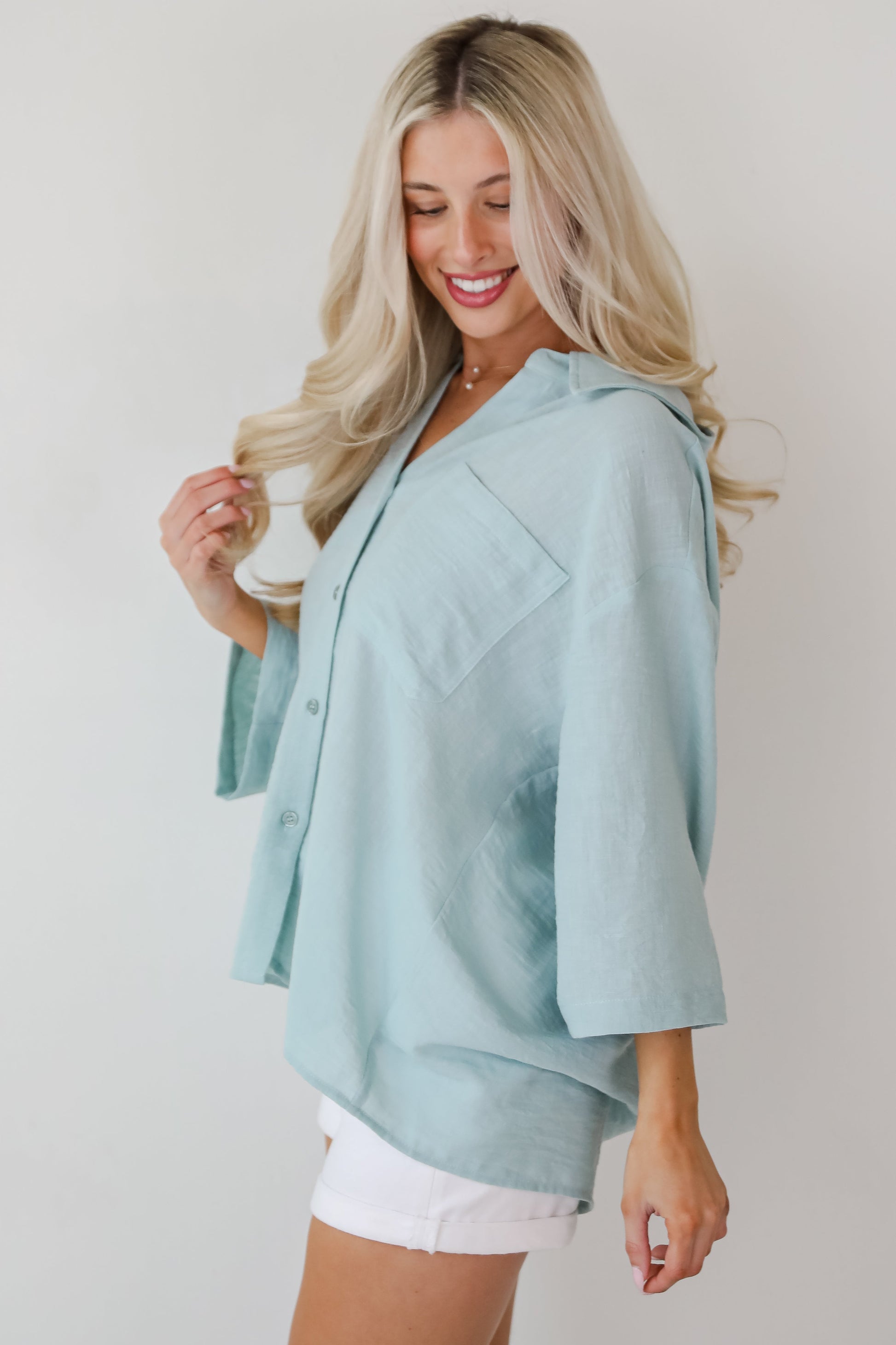 Life always feels the sweetest in the Sunny Mentality Sage Blouse! Designed with a loose. oversized fit. this blouse offers a comfortable. airy feel perfect for warmer days. The soft sage green color provides a subtle. earthy tone. making it easy to pair with anything from jeans to skirts. Featuring a classic button-up front and short sleeves. this blouse effortlessly combines timeless style with modern ease. Whether you're styling it for a casual day out or layering it over a tank for a laid-back look. this versatile piece will quickly become your new go-to!
