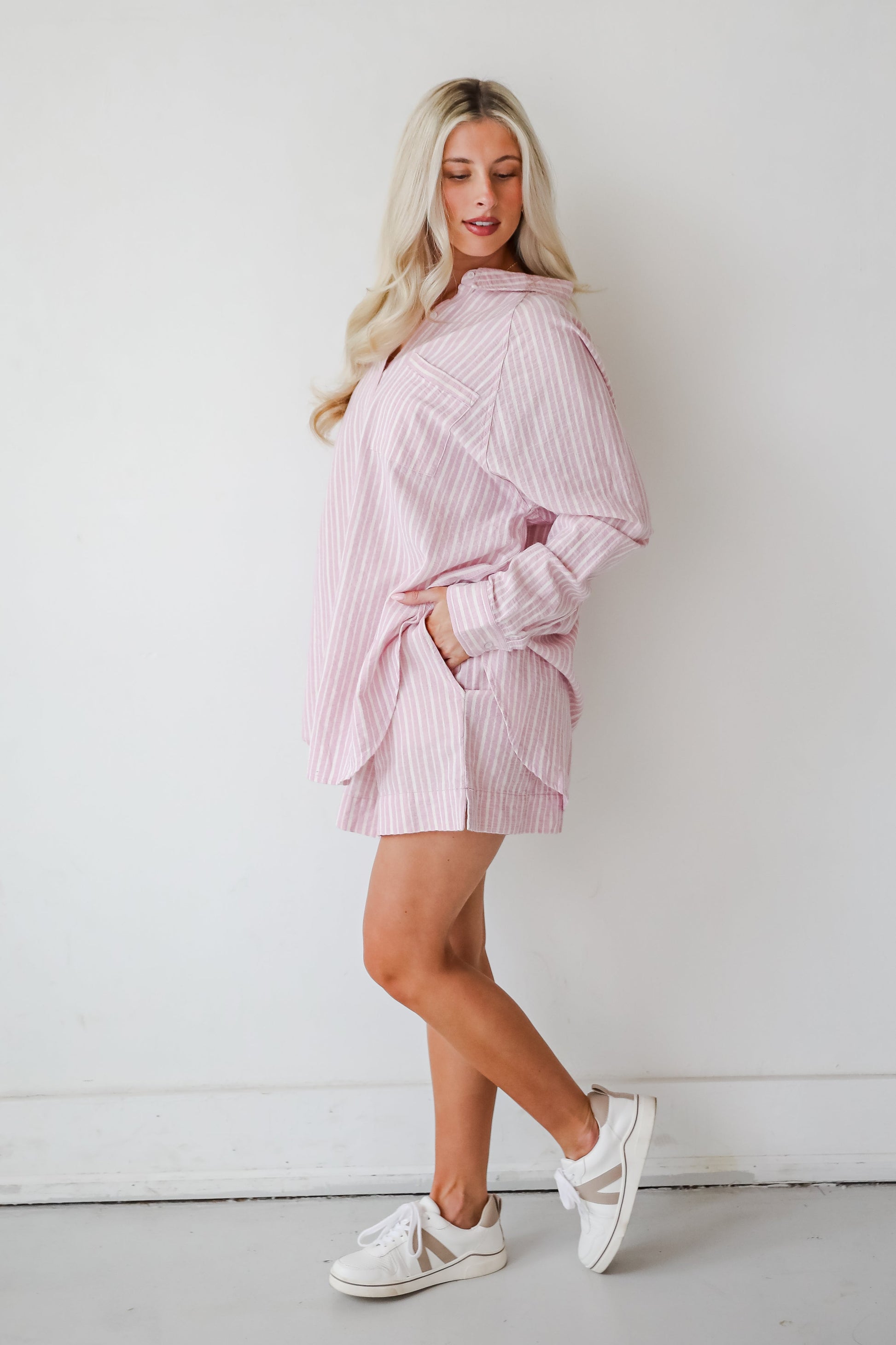 Twirl your way through your summer days in the Thriving Sunshine Pink Striped Button-Up Blouse! This blouse features soft pink and white stripes for a fresh. feminine look. The button-up design offers versatile styling options—wear it buttoned for a polished appearance or open over a tank for a laid-back vibe. The lightweight fabric ensures all-day comfort. while the relaxed fit gives it a breezy. effortless feel. Perfect for pairing with jeans. skirts. or shorts. this blouse is an easy way to add a cheerful. chic touch to any outfit!