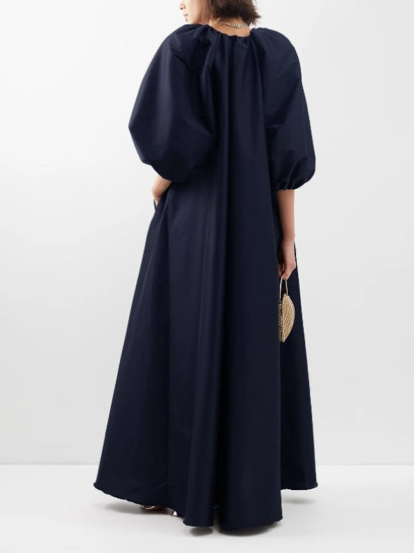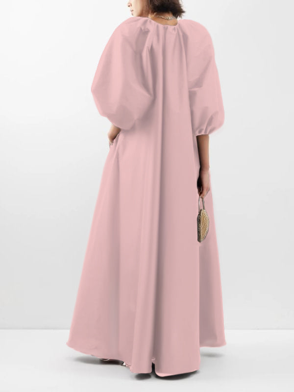 V-Neck Solid Color Puffy Sleeves Loose Maxi Dress