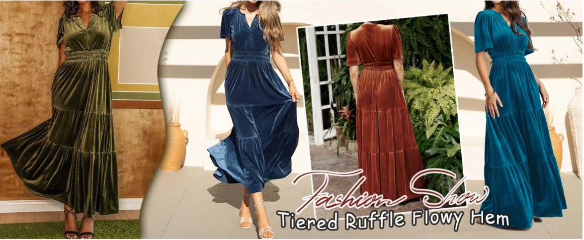 Made of soft and comfortable warm velvet stretch fabric. The elastic waistband and tiered ruffled flowing skirt can easily create a fitted look. casual and elegant.
