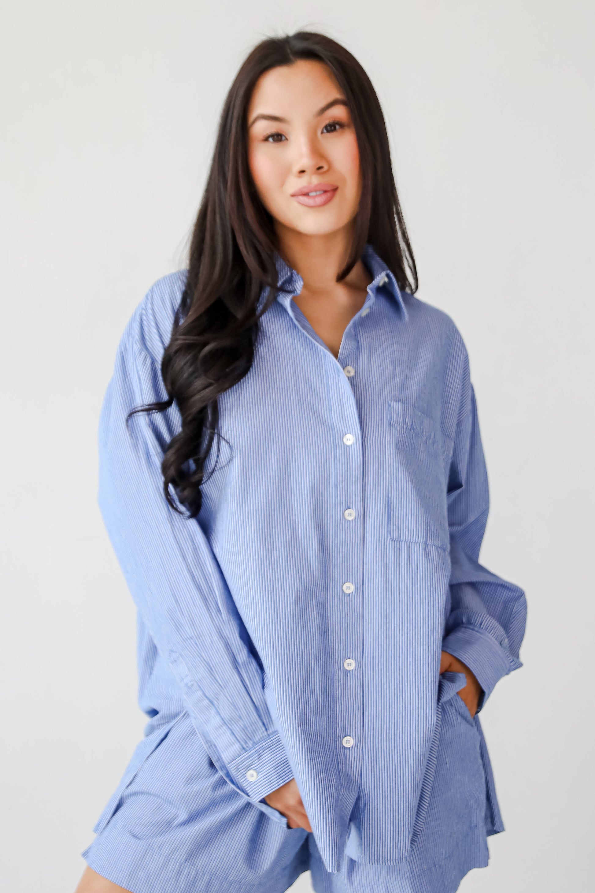 Head out the door and into a perfect day when you're wearing the Vacation Sun Blue Striped Button-Up Blouse! Crafted from lightweight and breathable fabric. this blouse offers both comfort and sophistication for any occasion. The crisp blue and white stripes add a touch of nautical-inspired flair. evoking images of sun-soaked seaside escapes and leisurely yacht outings. Whether you're heading to the office or meeting friends for brunch. this blouse is sure to make a stylish statement wherever you go. Dress it up with statement jewelry and heels for a night out. or keep it casual with sneakers and a denim jacket for a laid-back vibe!