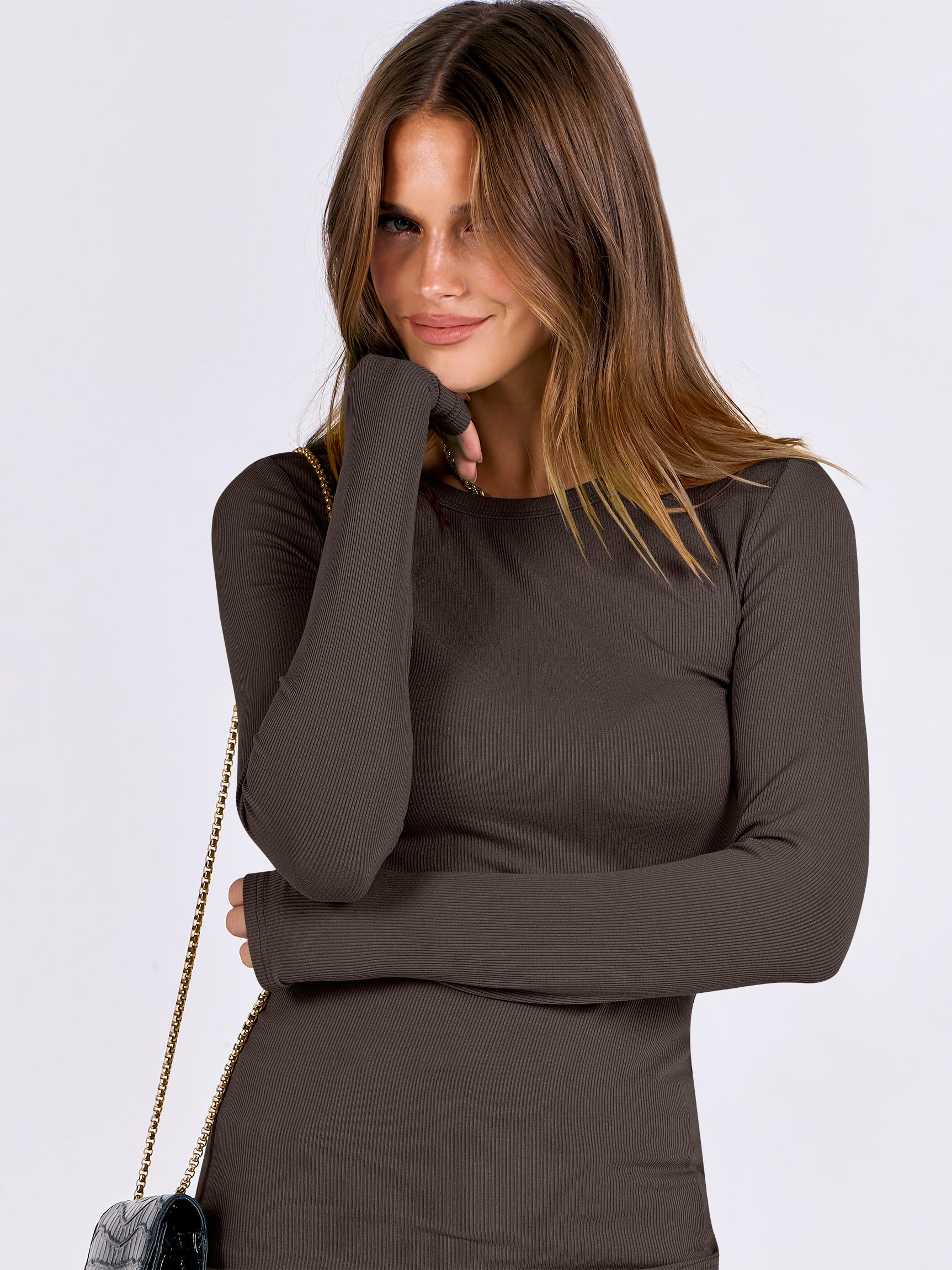 Women Long Sleeve Crewneck Rib Knit Slim Fit Shirts Basic Tee Tops
