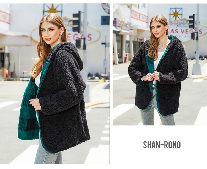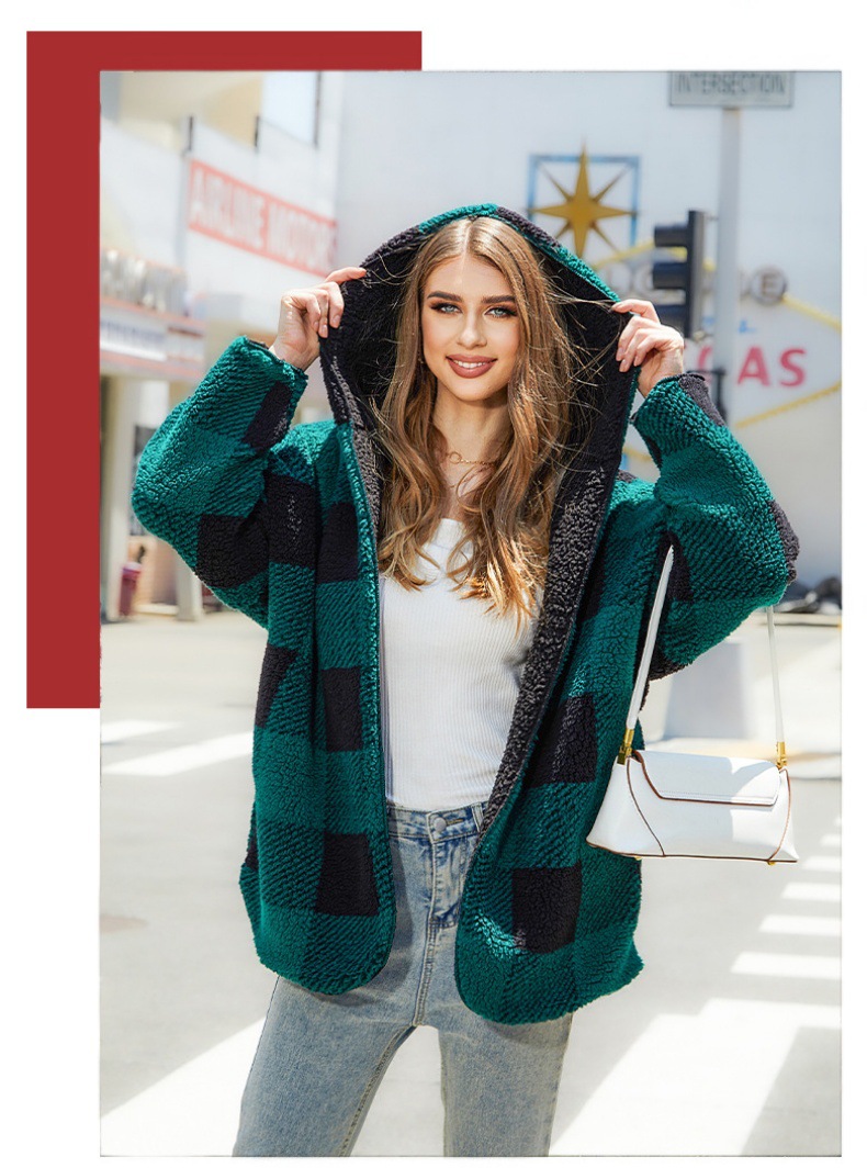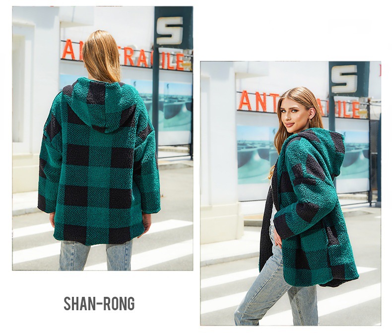 Women's autumn and winter plaid loose casual buckle-free cardigan double-layer plush coat
