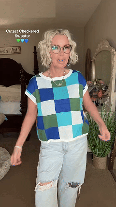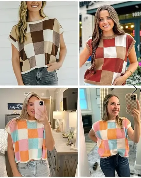 Elevate your wardrobe with our Women's Checkerboard Short Sleeve Color Block Knit Sweater. Crafted with quality material. this stylish piece offers unmatched comfort and versatility. Perfect for creating chic. casual looks with a touch of sophistication.
