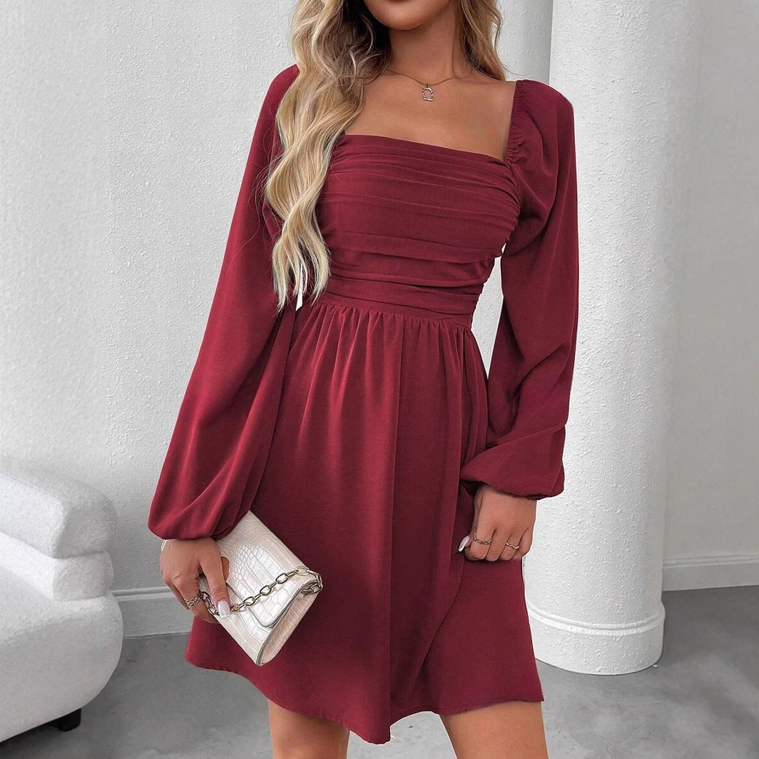 Women's Elegant Solid Color Lantern Long Sleeve Pleated High Waist Dress