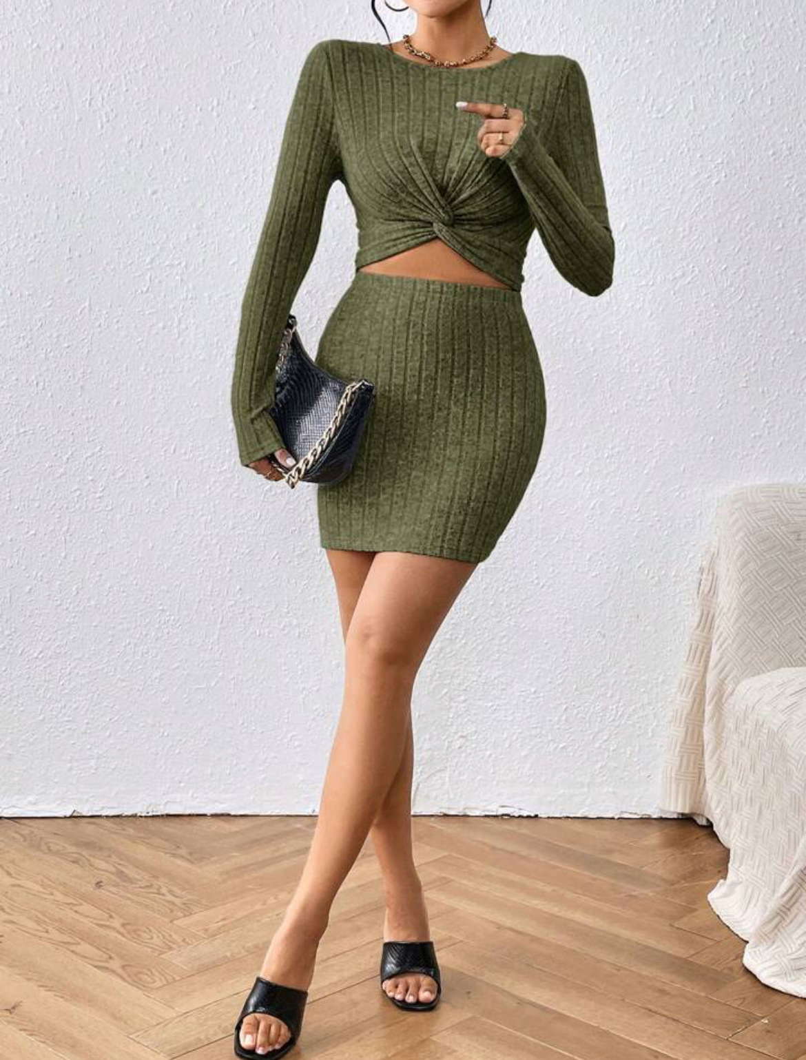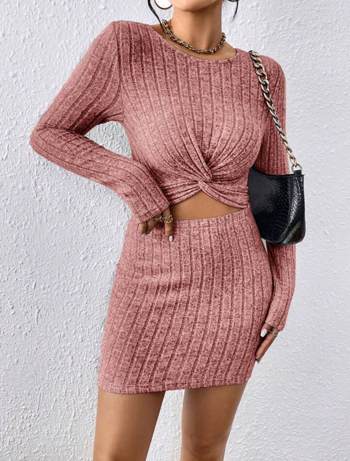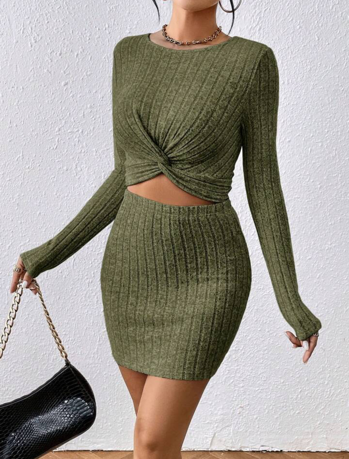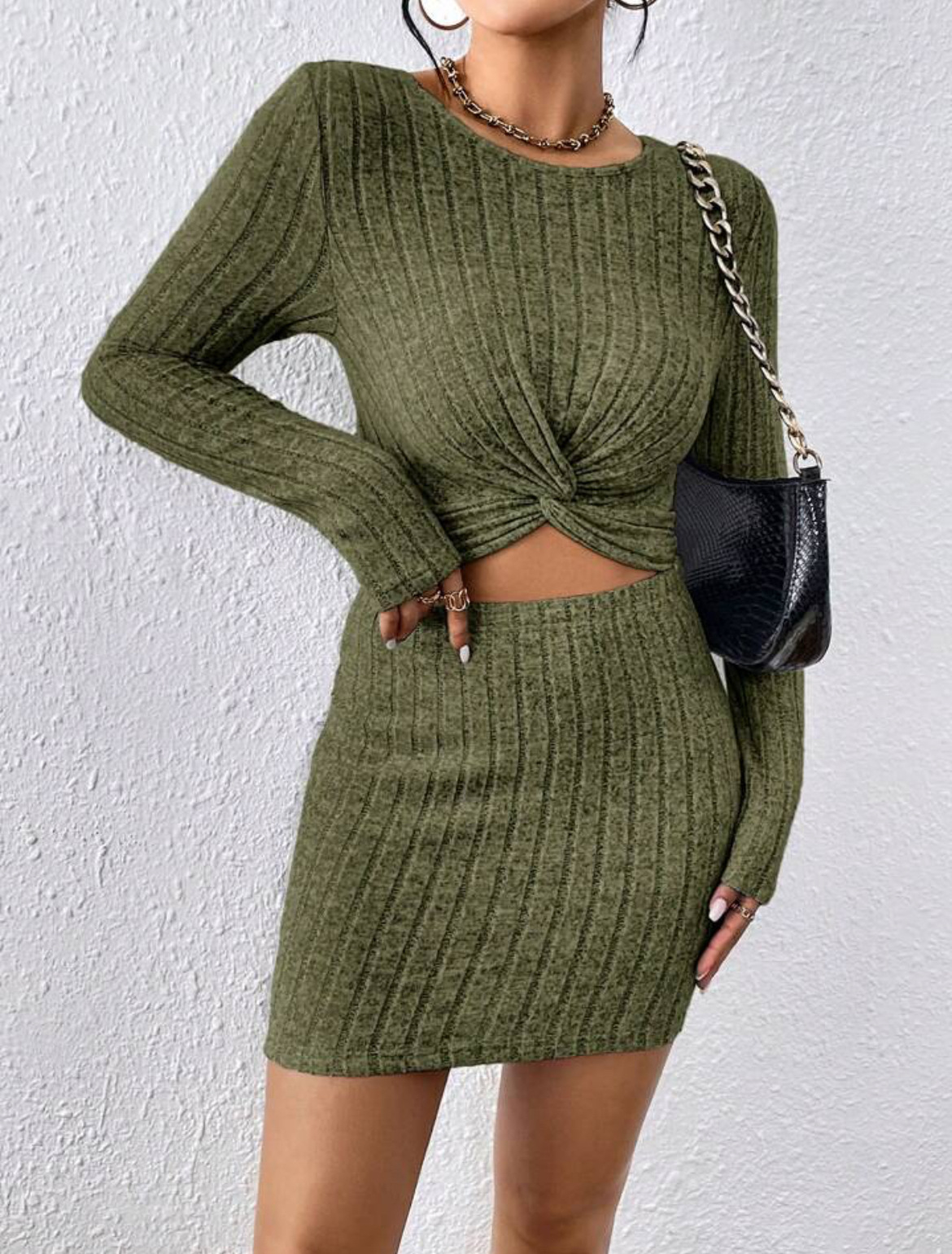 Women's round neck solid color long sleeve irregular knitting suit skirt