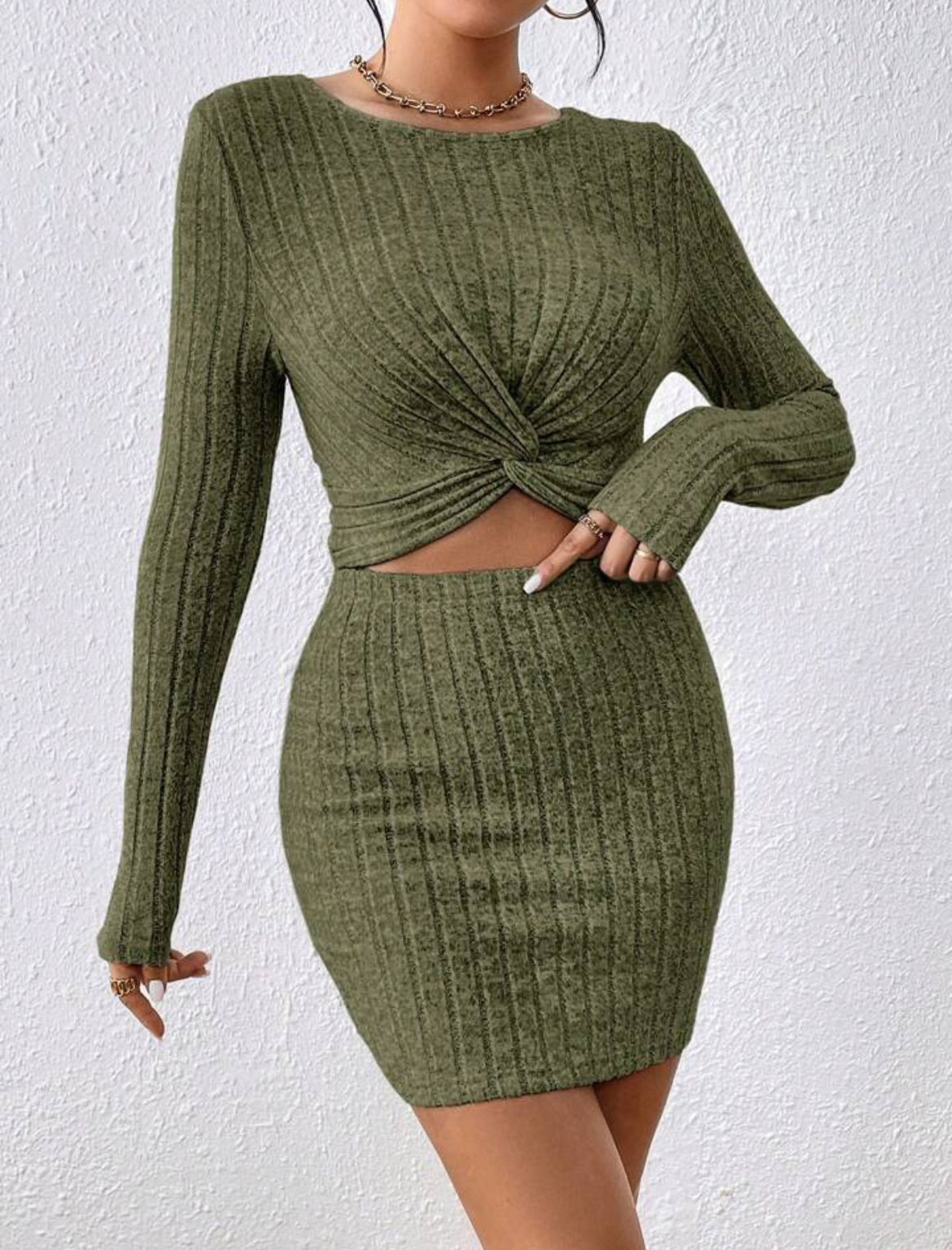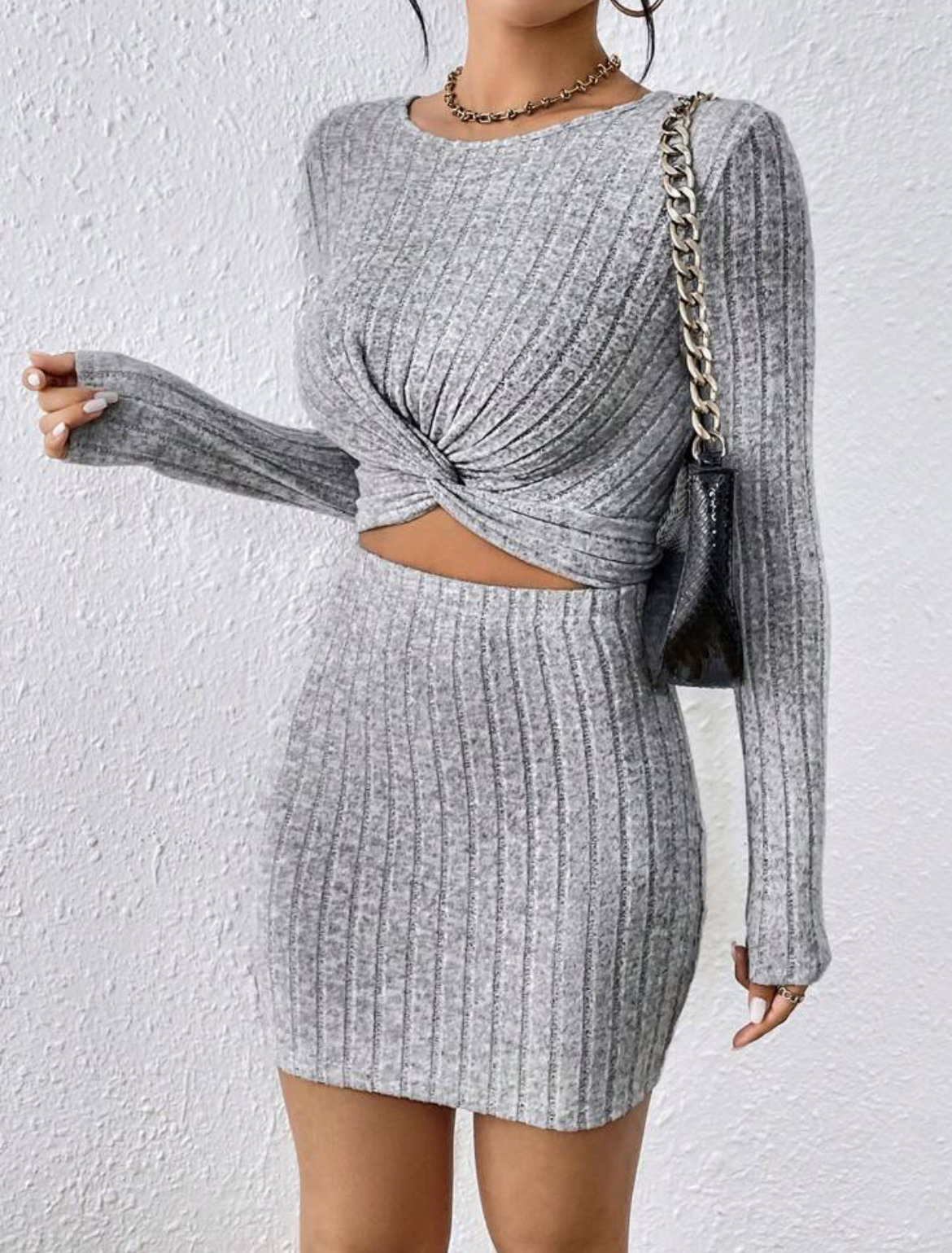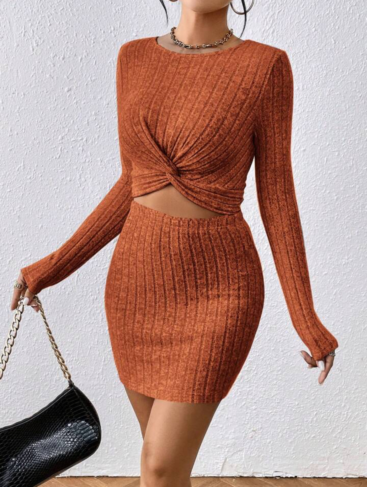 Women's round neck solid color long sleeve irregular knitting suit skirt