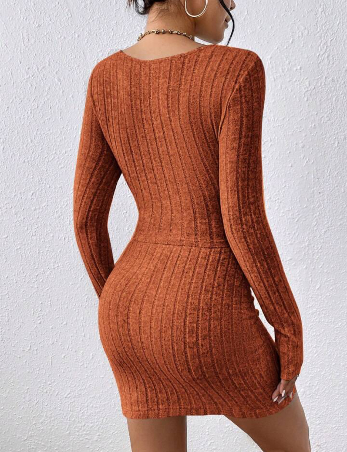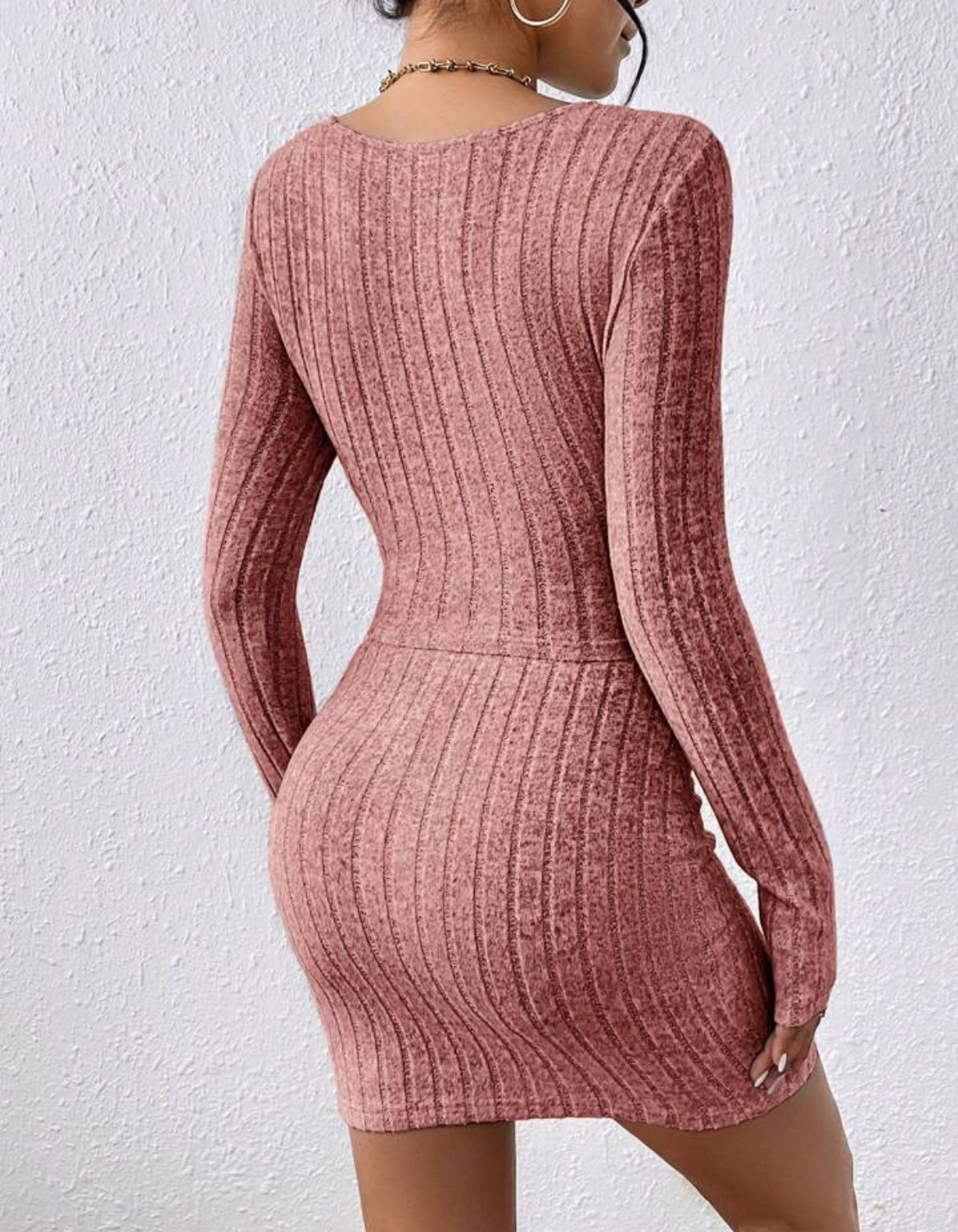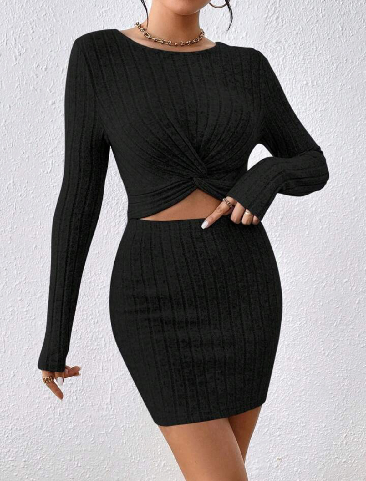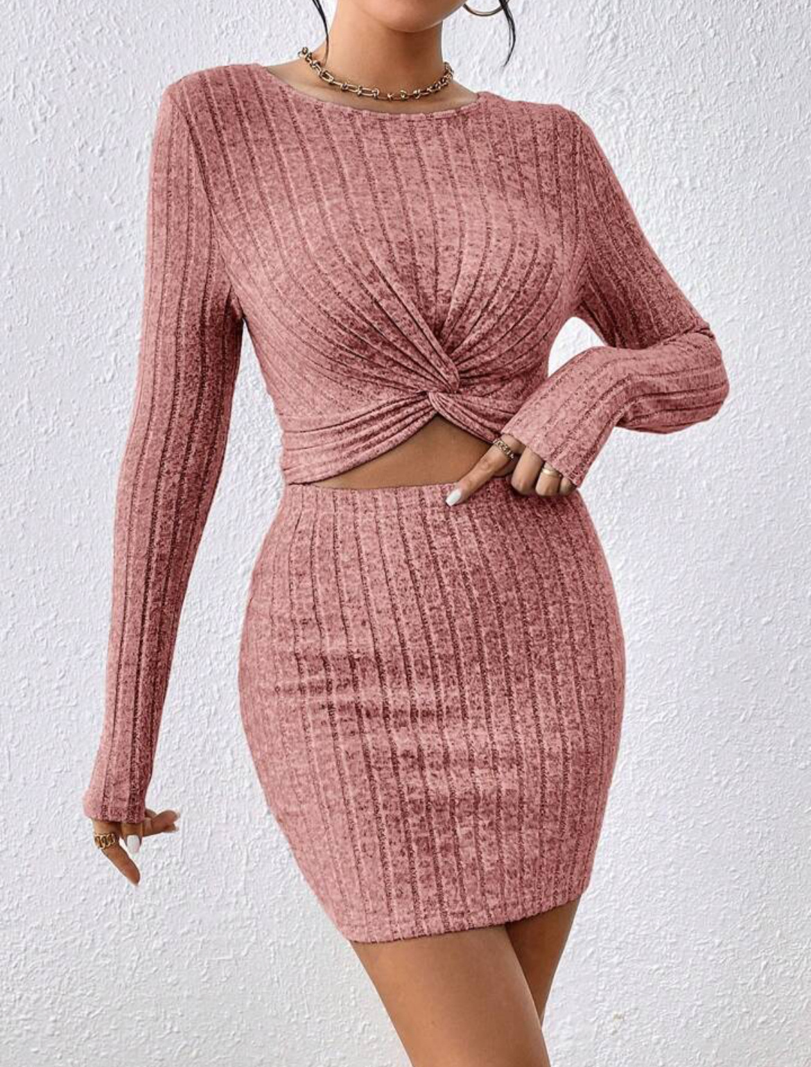 Women's round neck solid color long sleeve irregular knitting suit skirt