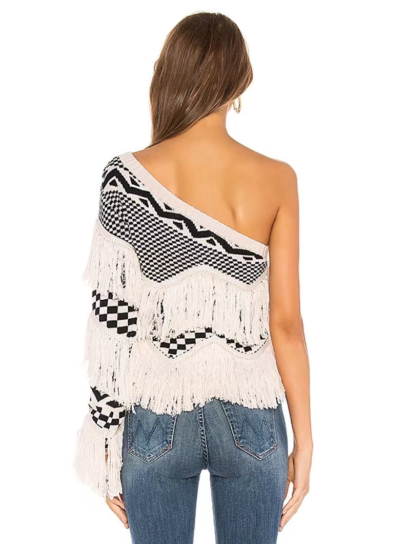 Women's sweater plaid one-shoulder cold-shoulder tassel sexy knitwear