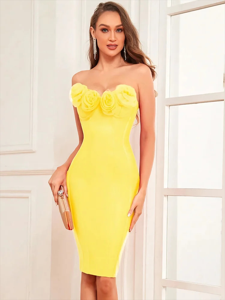 Yellow 3D Flower Slim Bodycon Bandage Dress Party